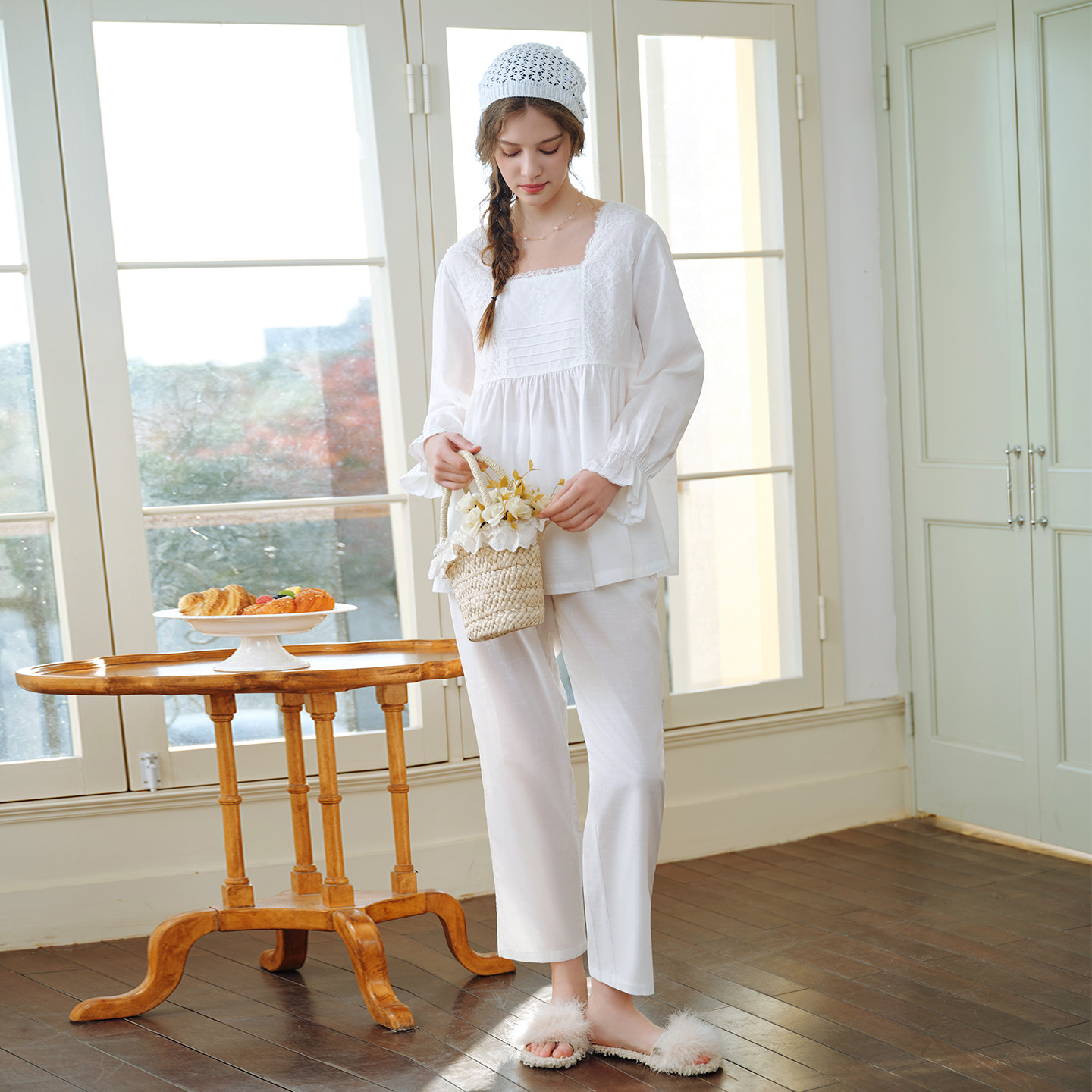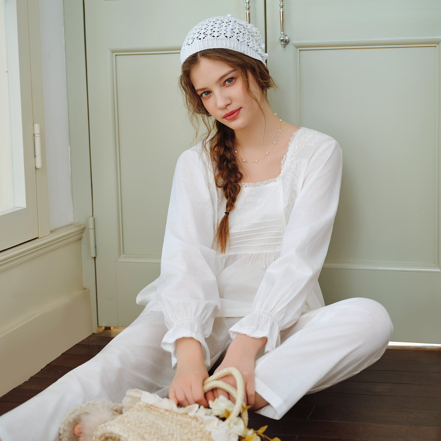 美标春夏新品长袖棉睡衣套装女复古甜美蕾丝宫廷风莱赛尔家居服秋