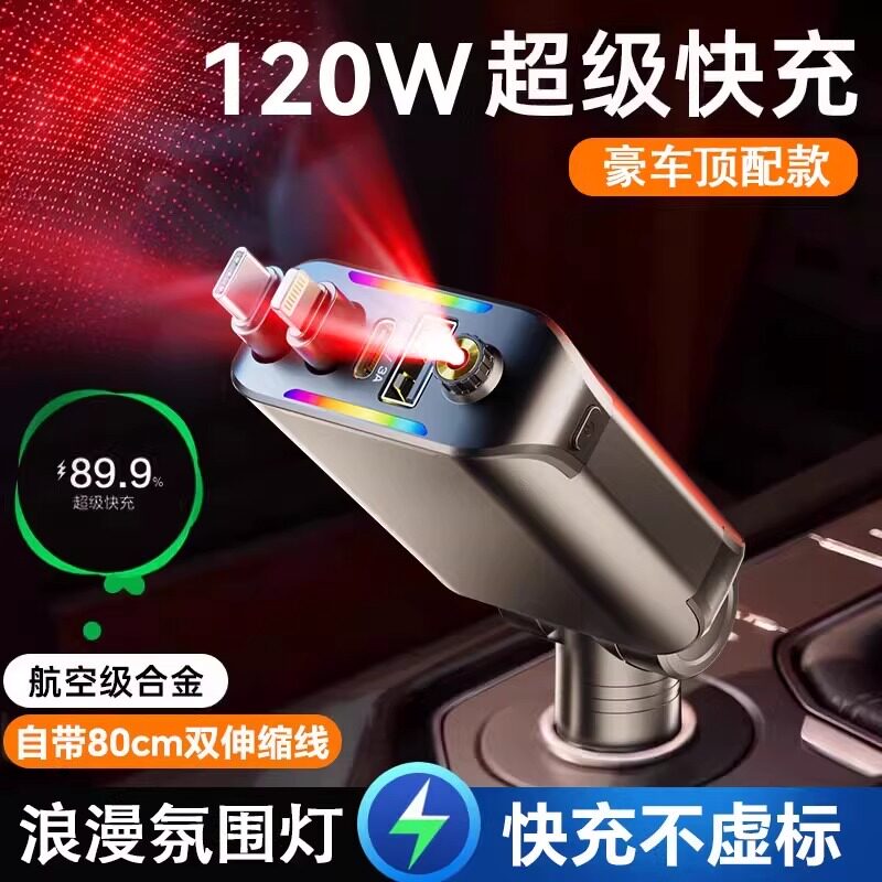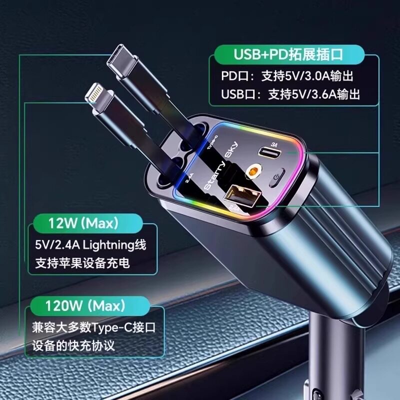 星空顶车载充电器120W手机超级快充伸缩线一拖四汽车usb点烟器口