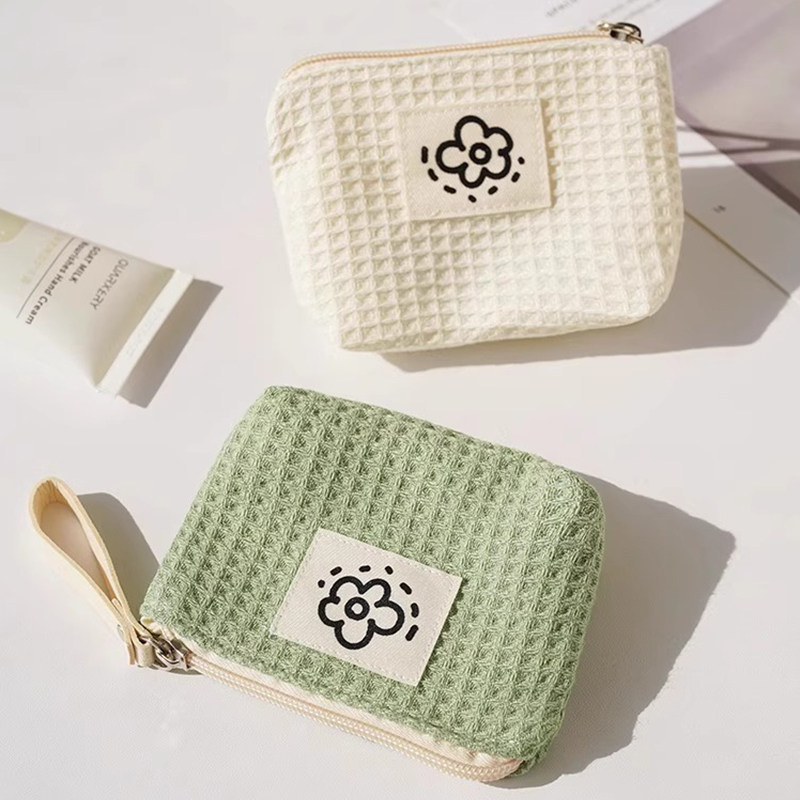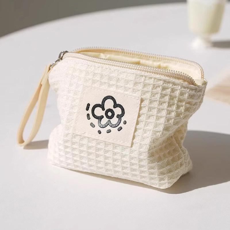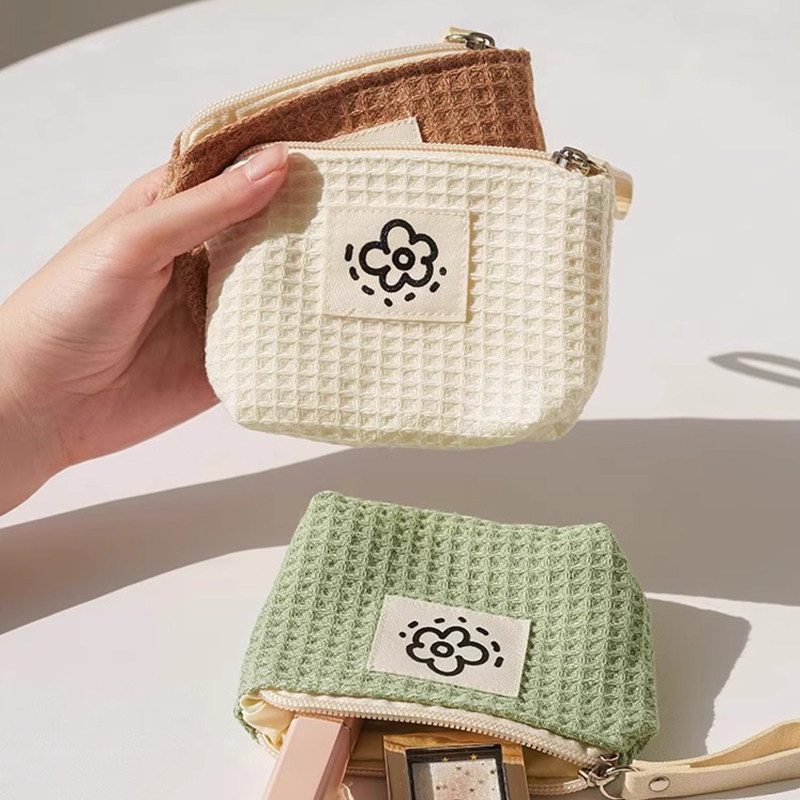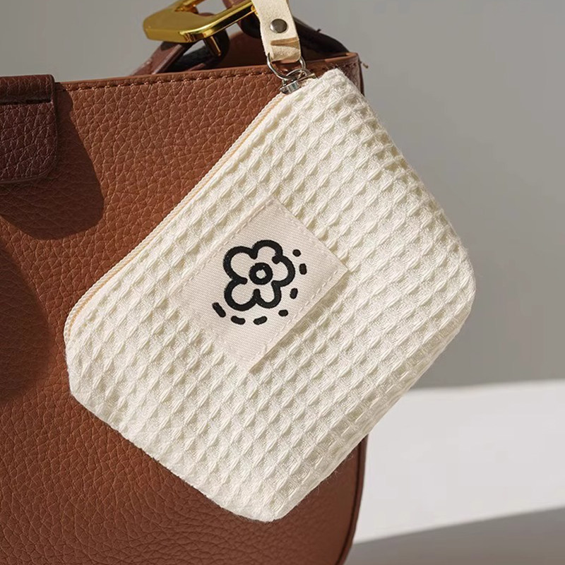 日系可爱零钱包简约华夫格收纳包女便携手腕包花朵mini小巧手提包
