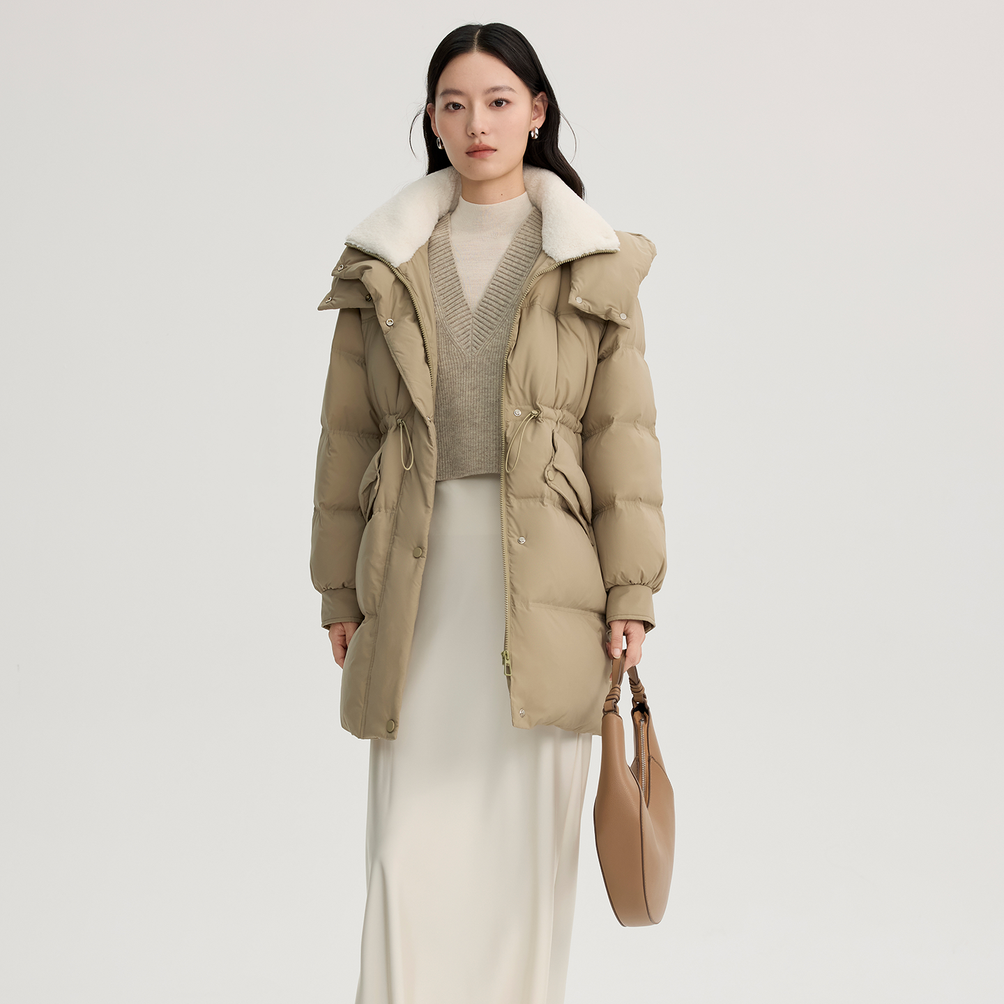艾莱依羽绒服女冬新款收腰中长款大衣保暖防风休闲仿羊羔毛领外套