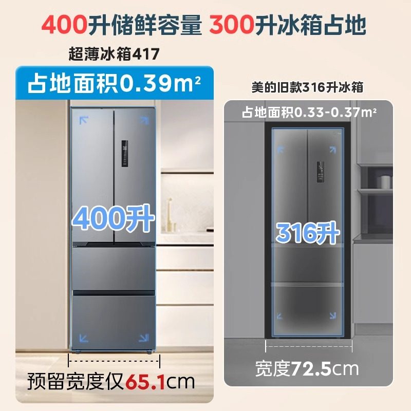 美的417冰箱60cm超薄底部散热嵌入式法式多门小户型家用一级能效