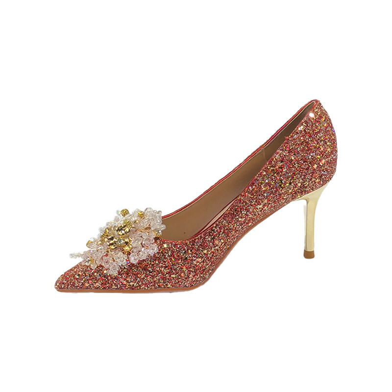 婚鞋女2024年新款主婚纱新娘鞋亮片香槟色水晶鞋尖头细跟高跟鞋女