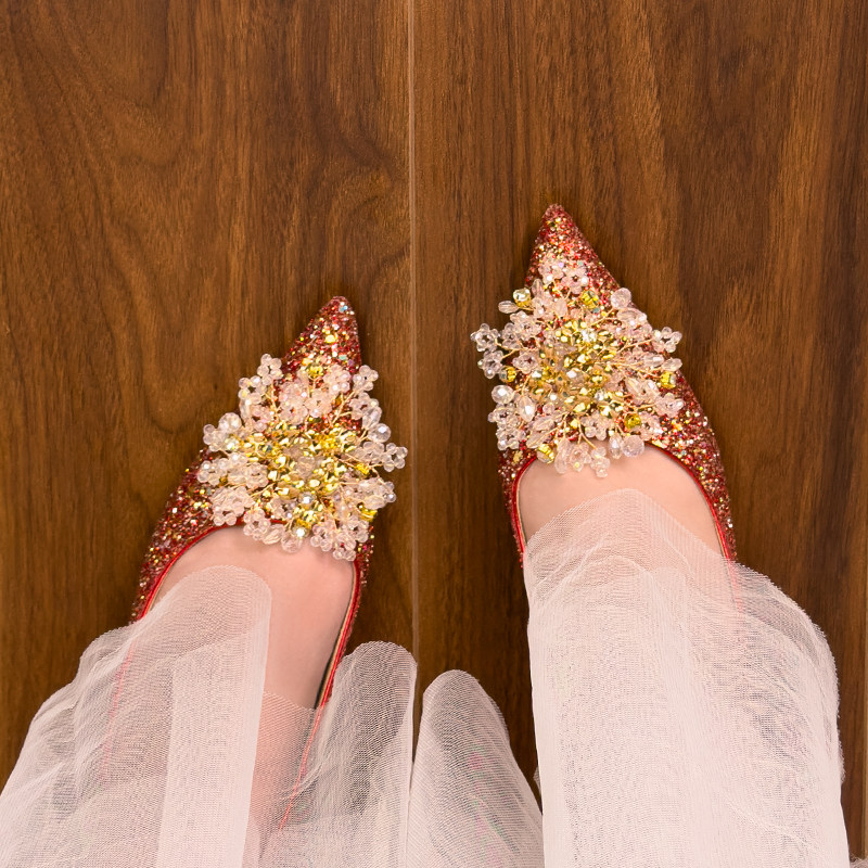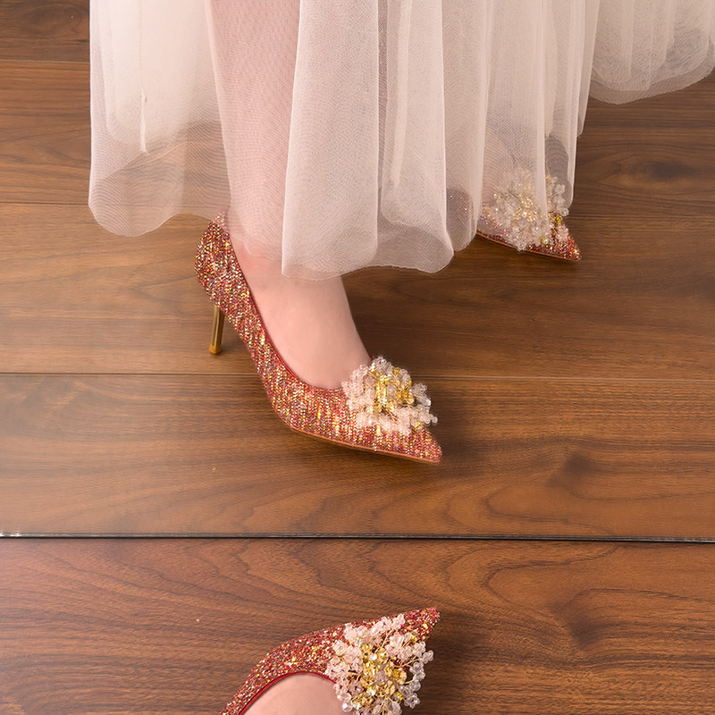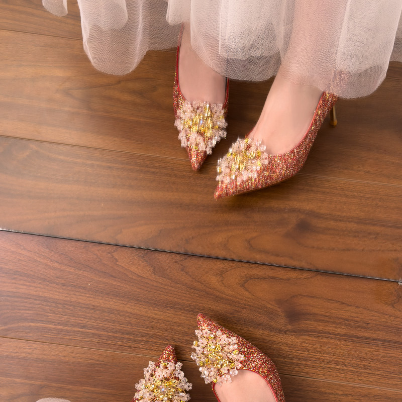 法式水晶亮片婚鞋女2025新款秀禾婚纱两穿订婚鞋不累脚细跟高跟鞋