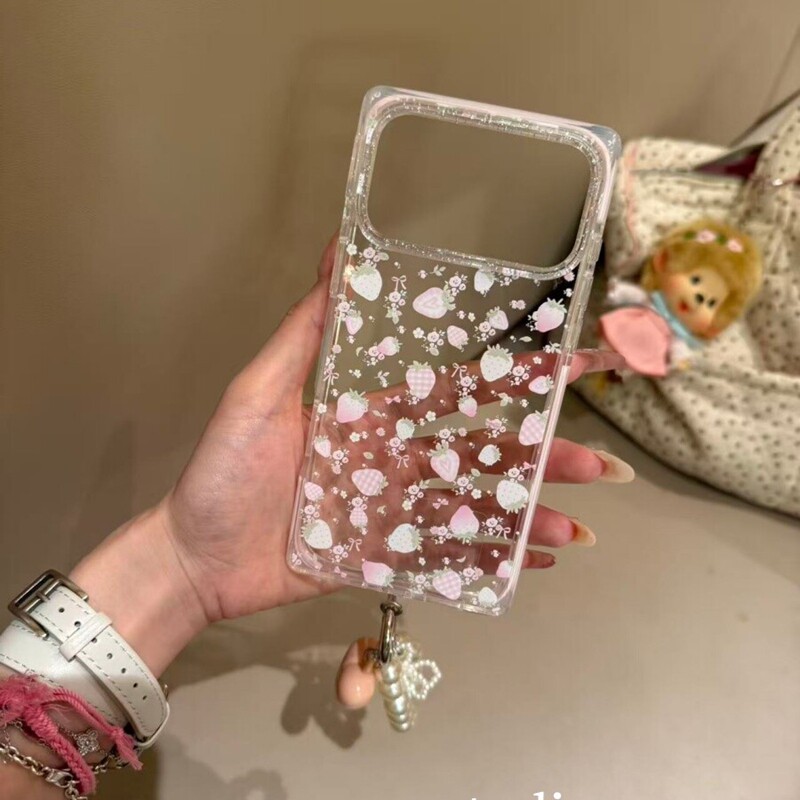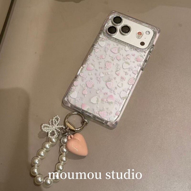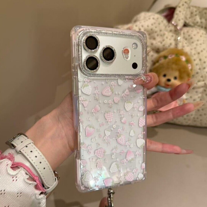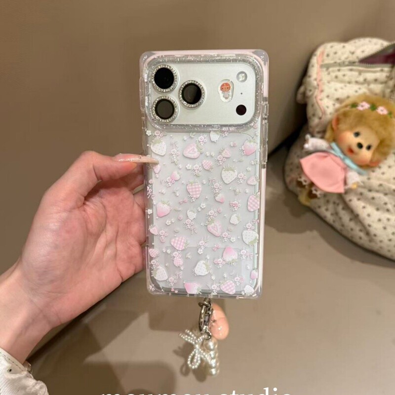 ins少女心满屏碎花粉草莓带挂链适用苹果17promax新款iPhone16promax手机壳15P小众甜美17Pro小清新16P保护套