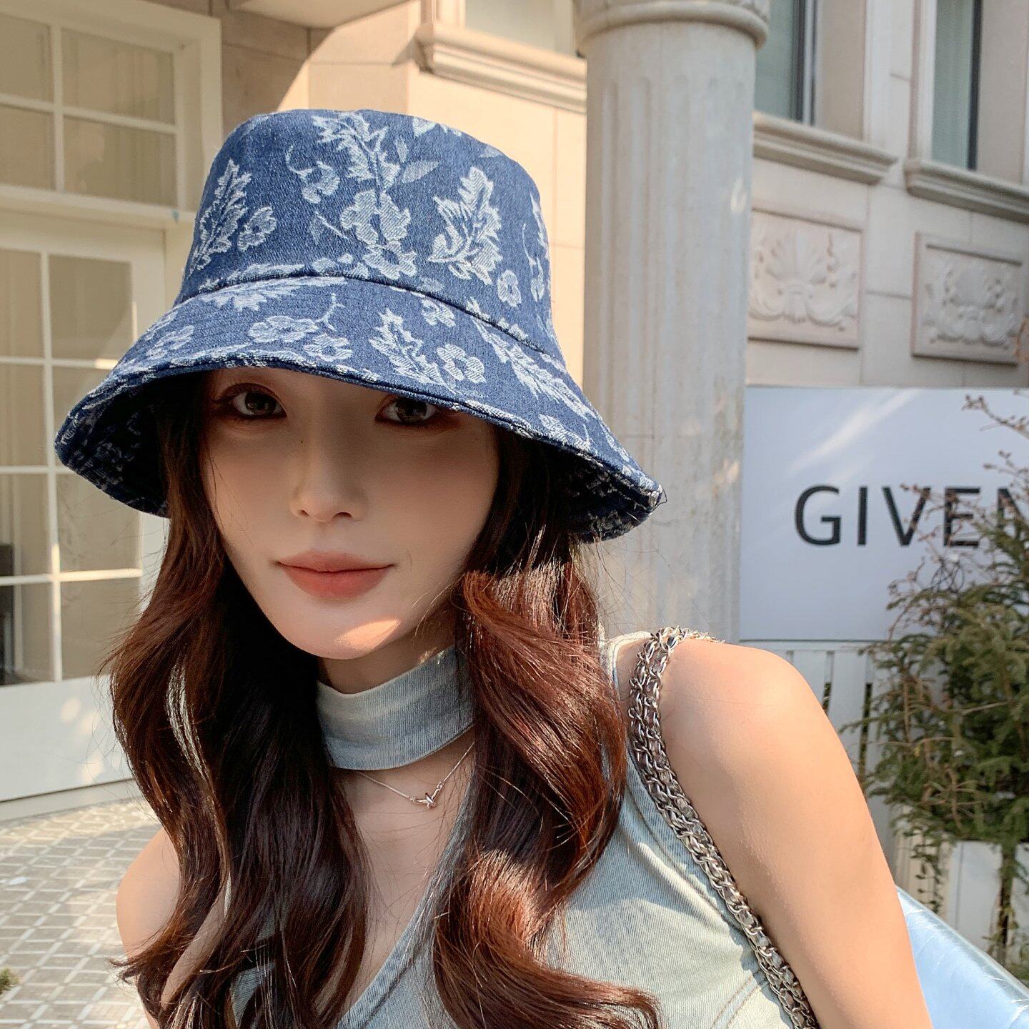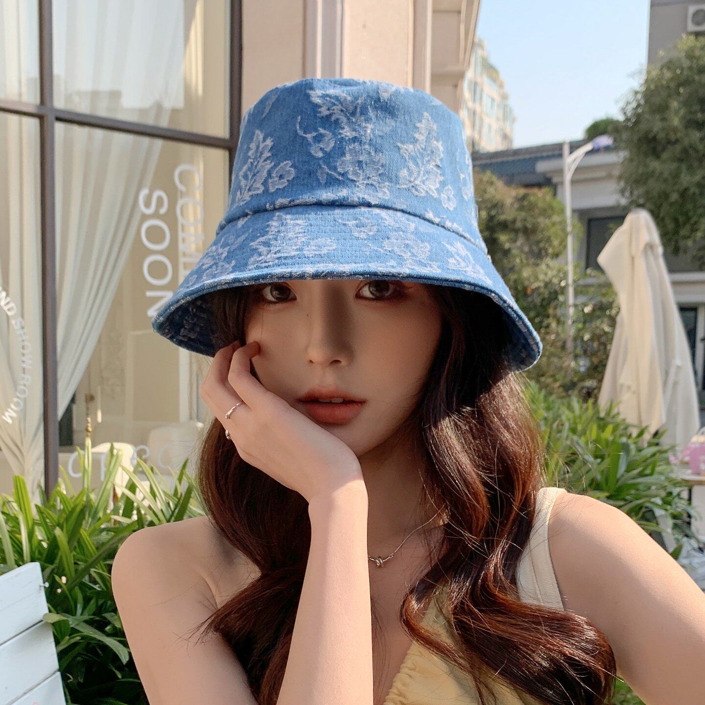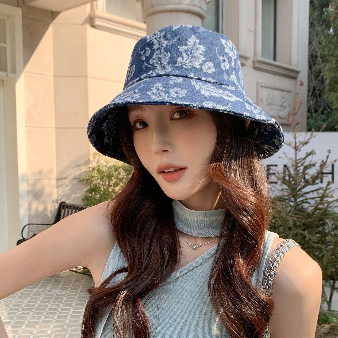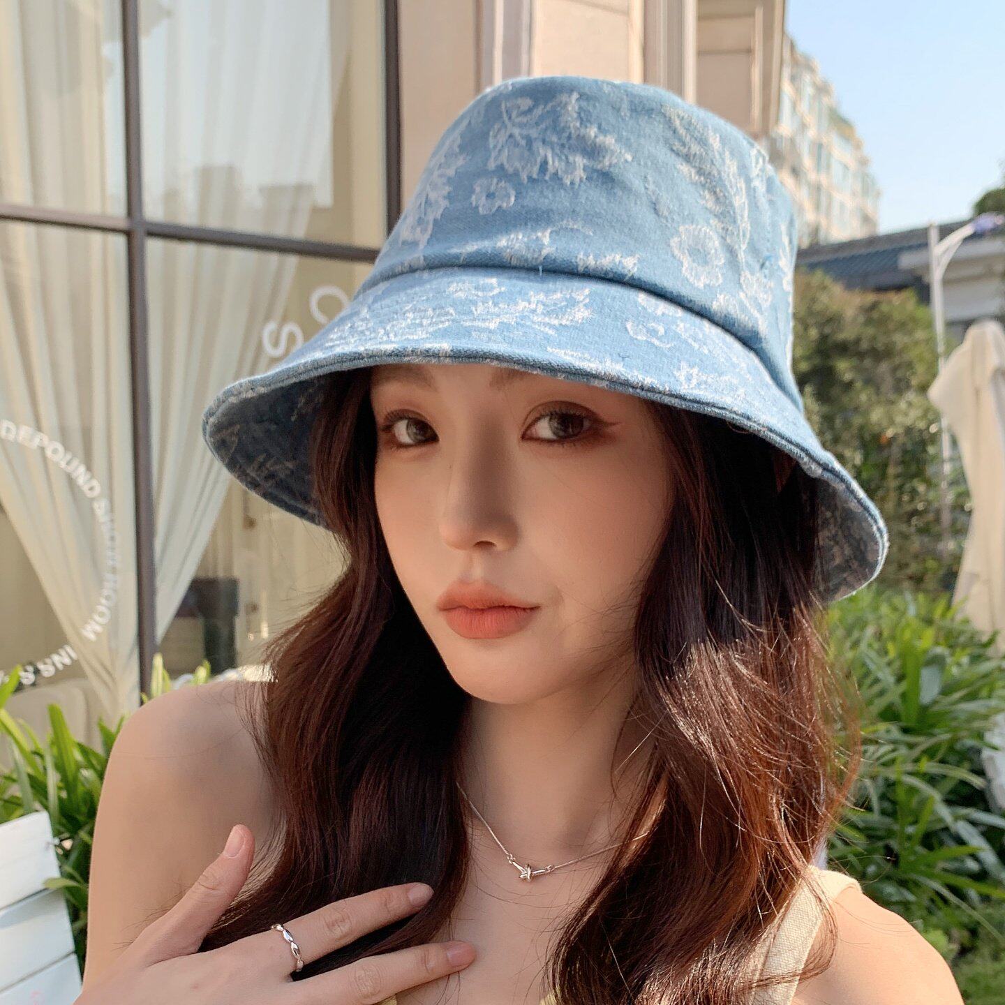 春夏季女时尚织花朵牛仔布渔夫帽遮阳防晒旅游街头盆帽子户外宽檐