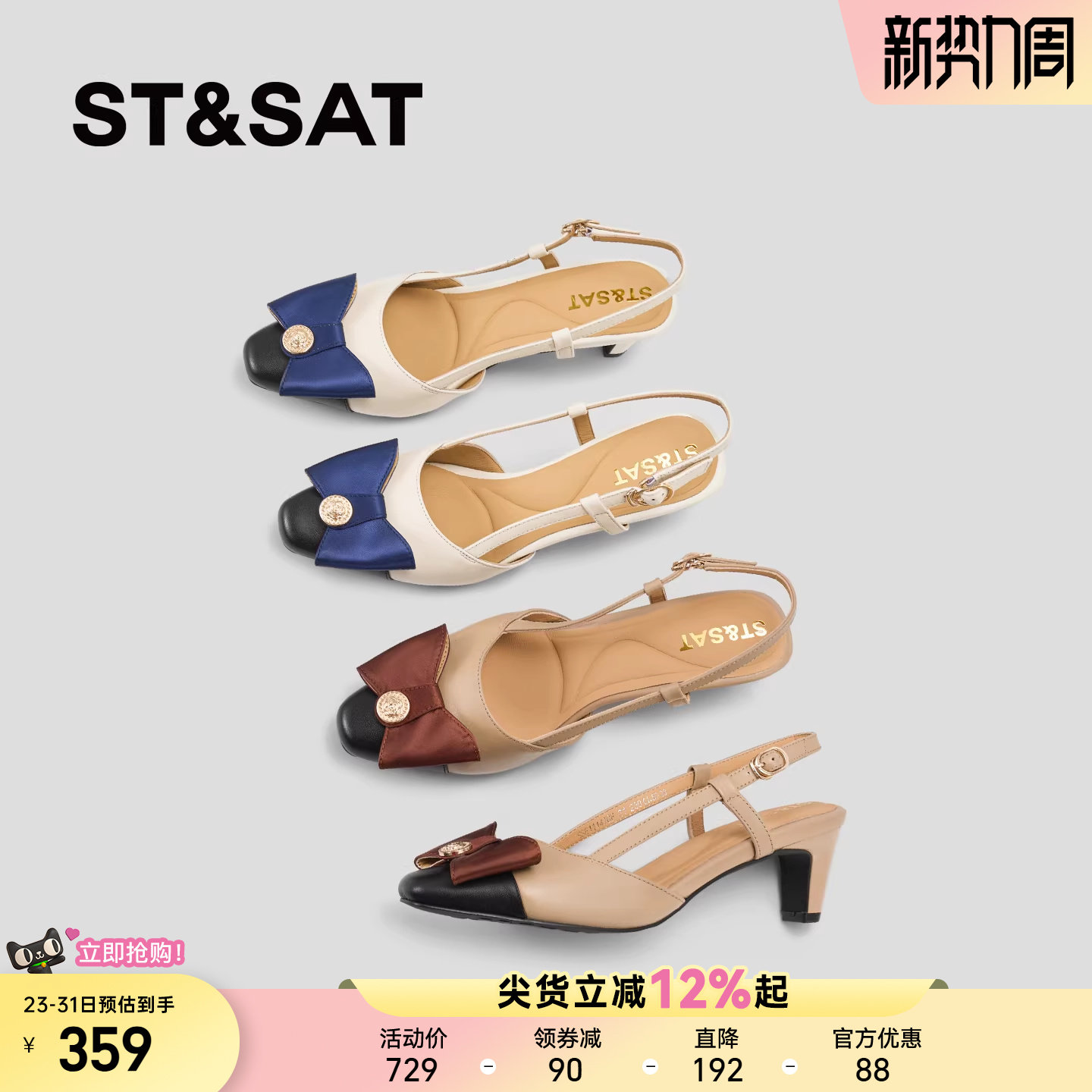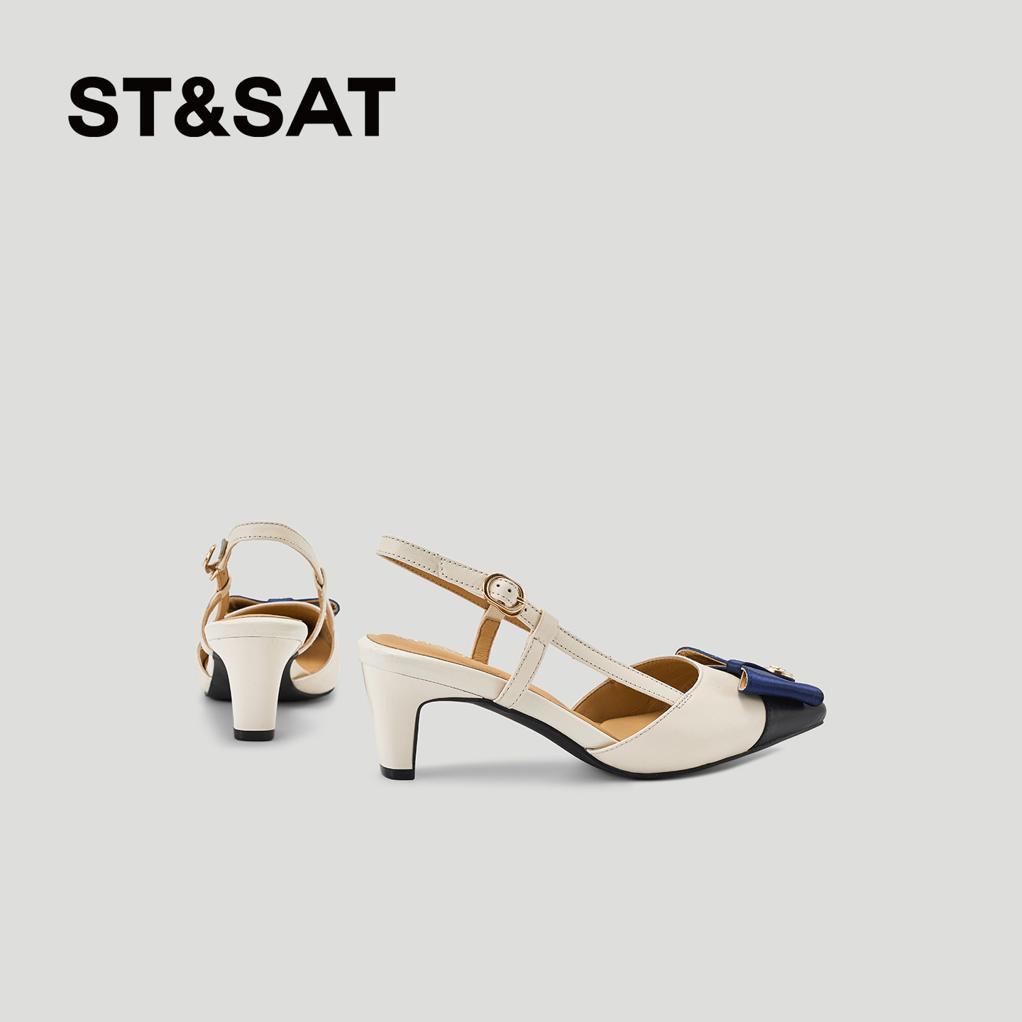 星期六小香风包头凉鞋女真皮拼色蝴蝶结粗跟高跟鞋2026配裙子单鞋