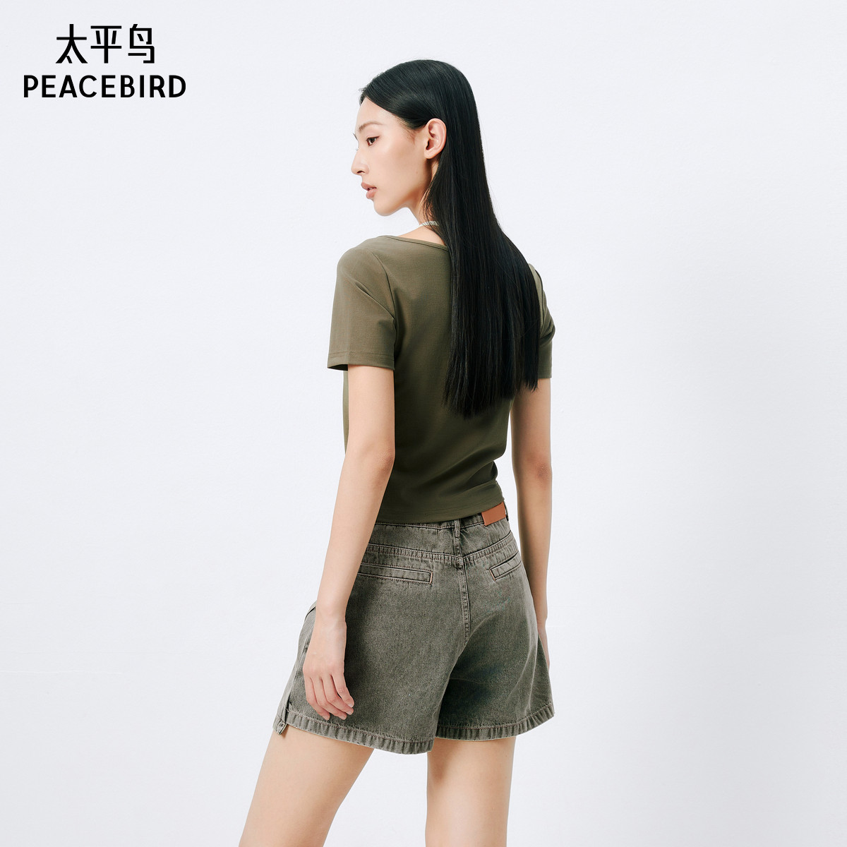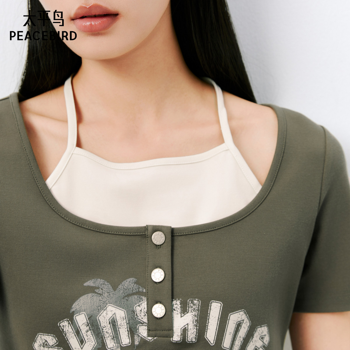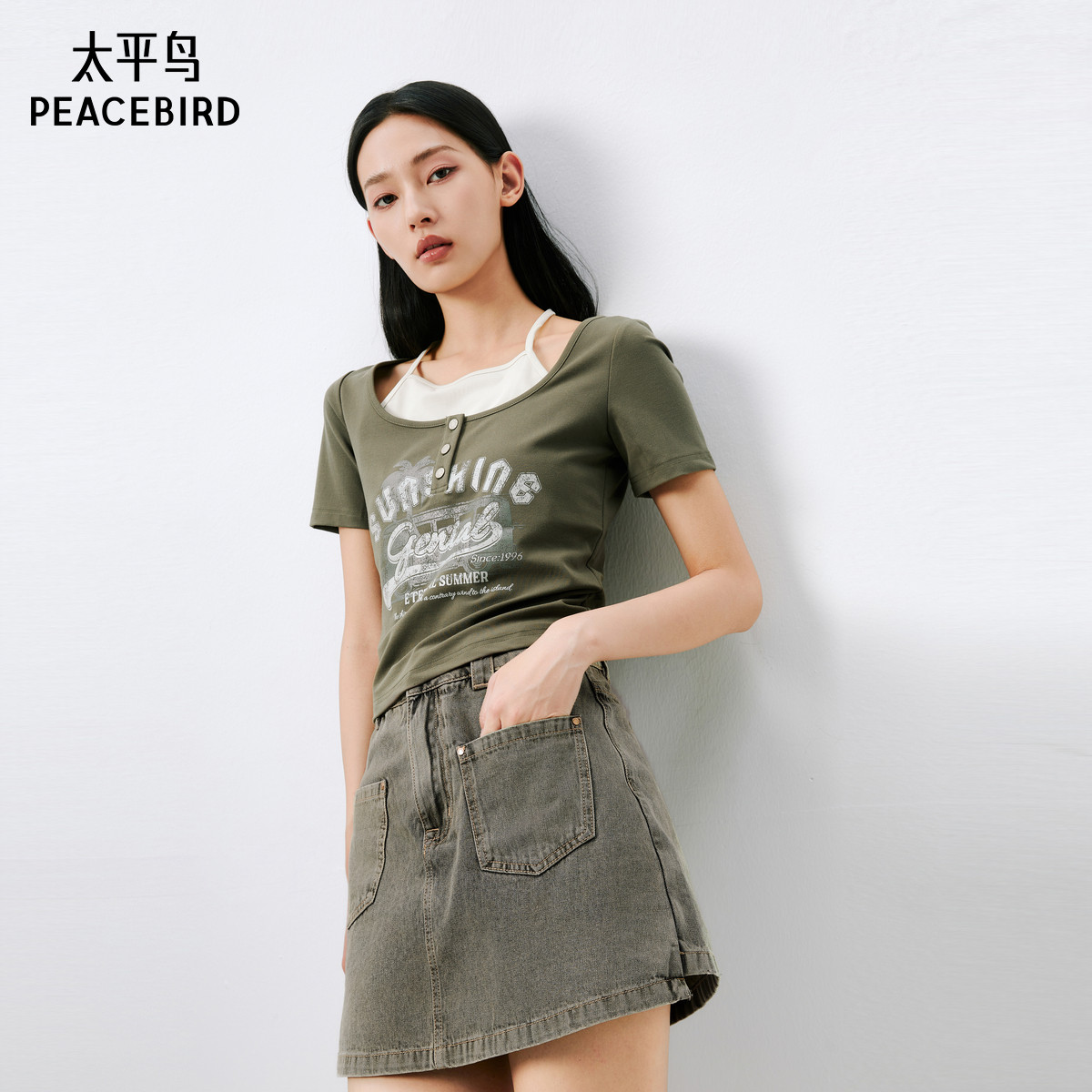 太平鸟美式假两件T恤女短袖夏款修身短款辣妹时尚小上衣潮