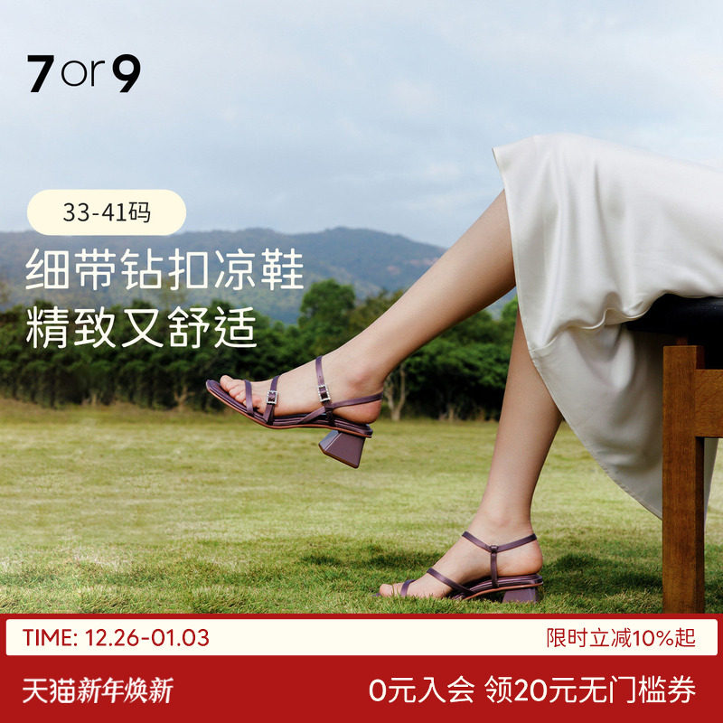 7or9紫藤花一字带粗跟凉鞋女高跟鞋通勤舒适简约沙发系粗跟鞋