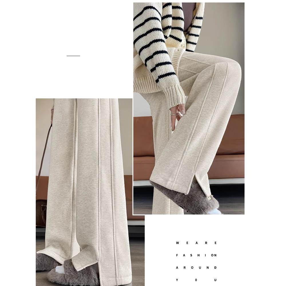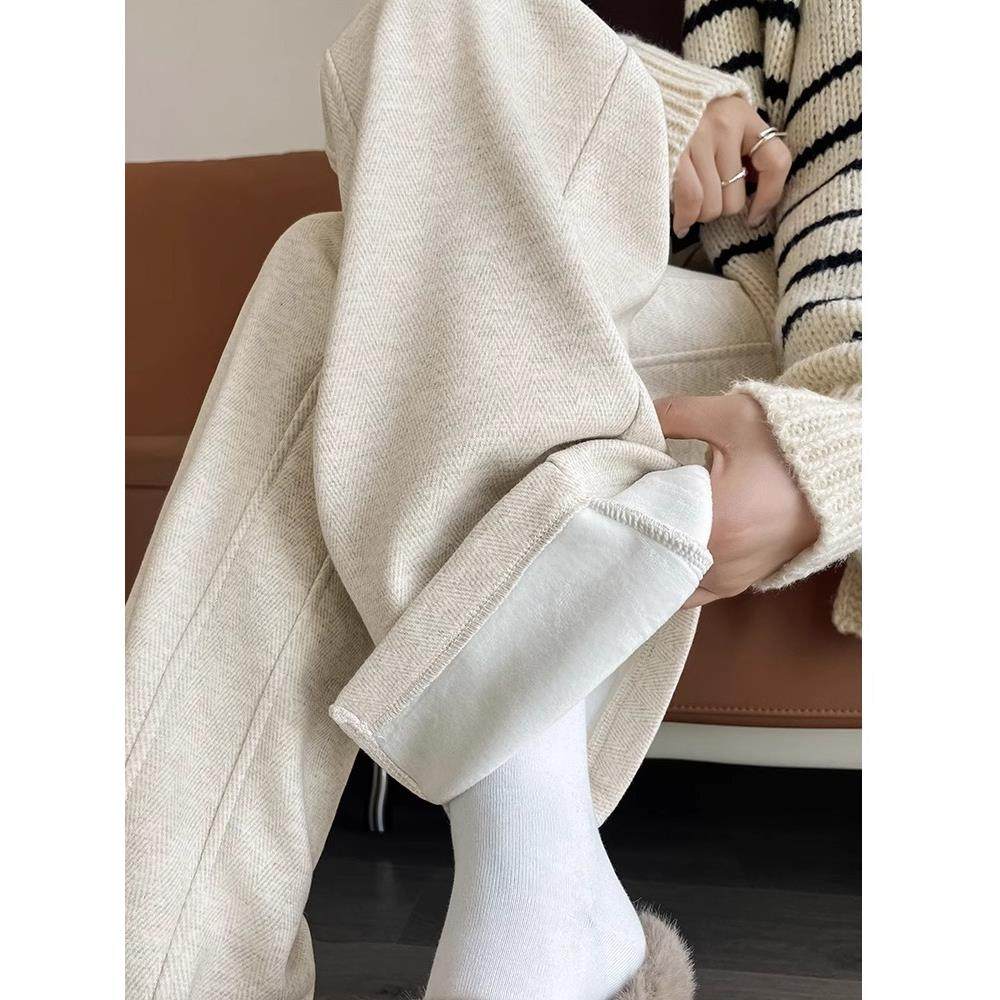 毛呢裤子女秋冬高腰加绒加厚阔腿裤女窄版直筒休闲杏色羊绒垂感