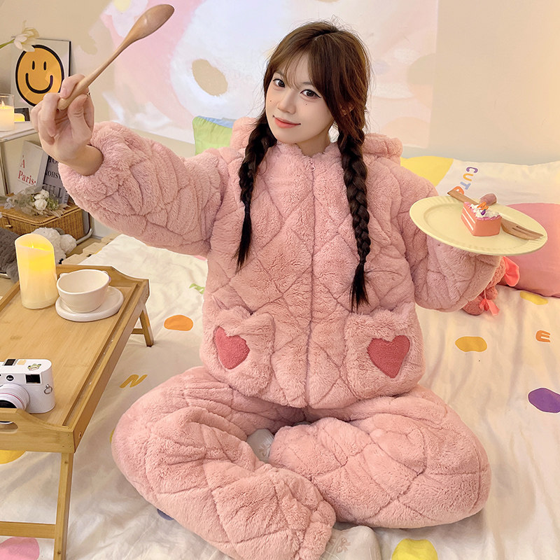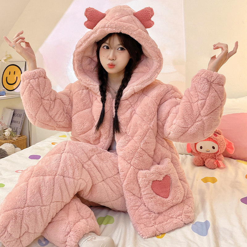 珊瑚绒睡衣女秋冬季2025年新款三层夹棉加厚保暖法兰绒大码家居服
