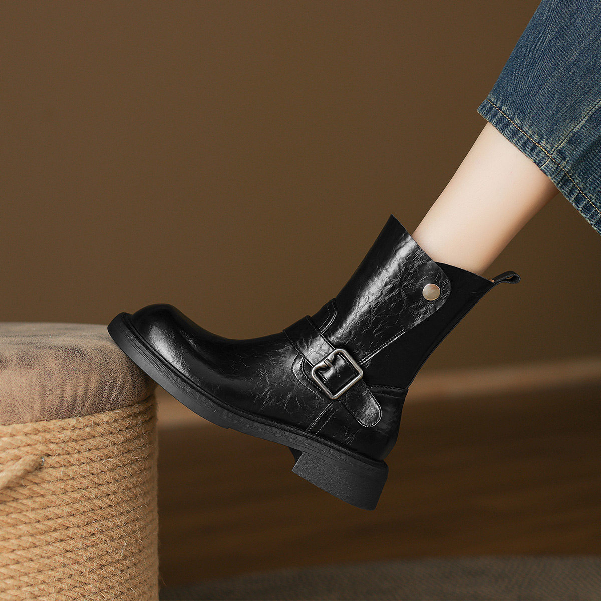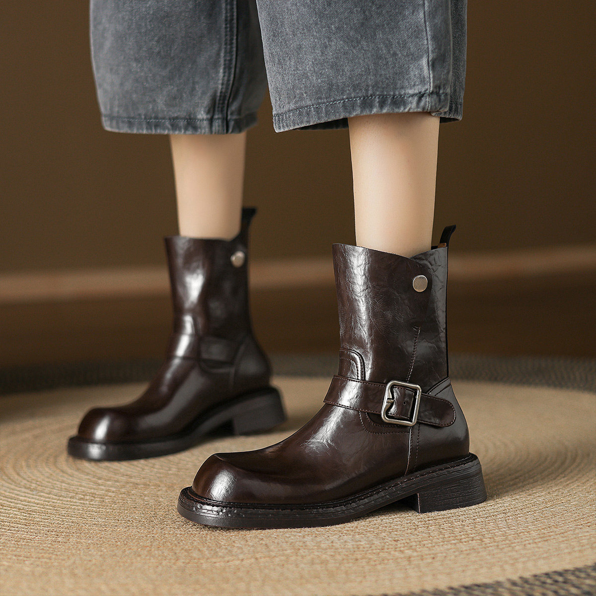 阿么手工女鞋皮带扣欧美风机车靴高级感复古真皮百搭短靴秋冬新款