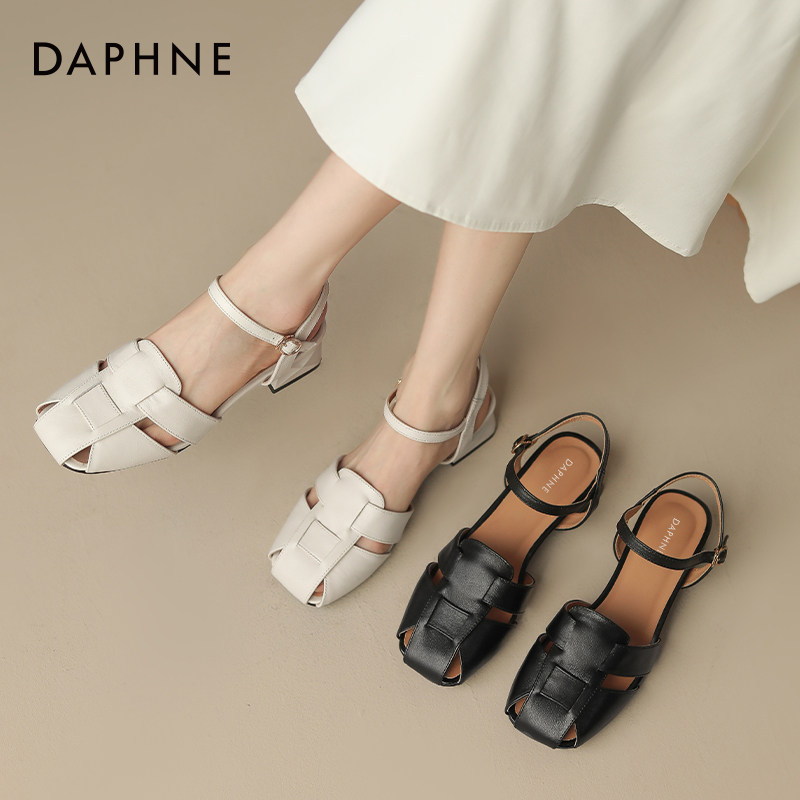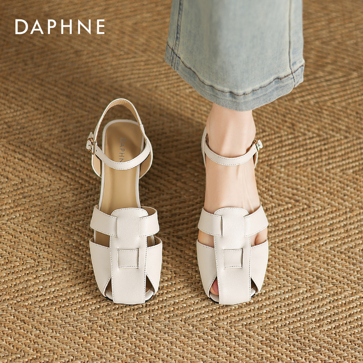 达芙妮凉鞋女款2026新款夏季中跟编织单鞋镂空外穿包头法式罗马鞋