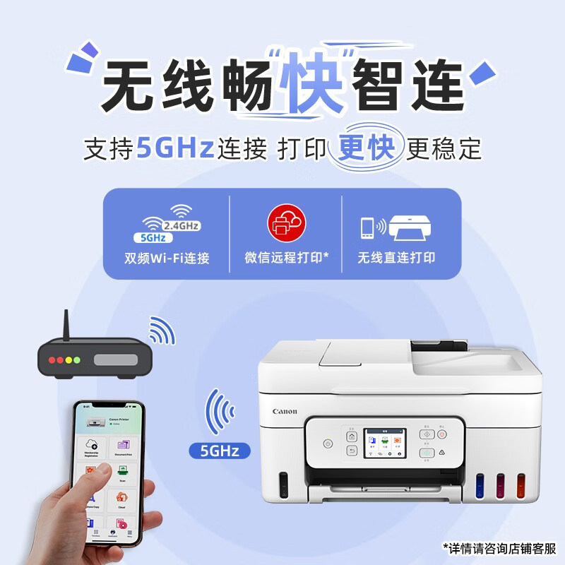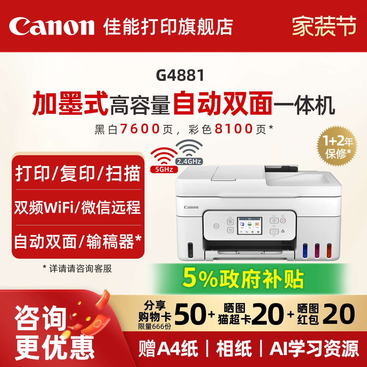 佳能旗舰店G4880/G4881/G4891自动双面一体机原装加墨彩色A4复印扫描传真无线WiFi微信远程打印家用办公