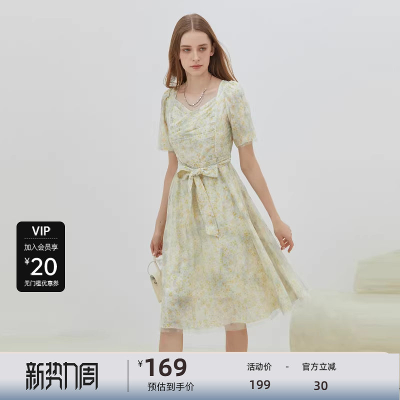S·DEER圣迪奥女装方领晕染网纱收腰泡泡袖连衣裙S223Z122Q