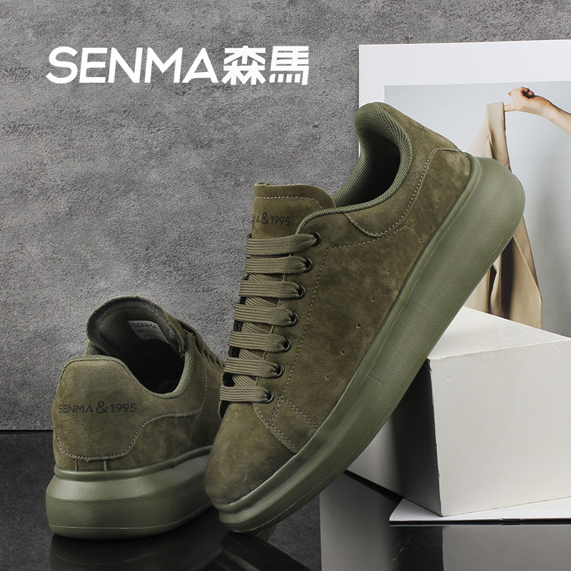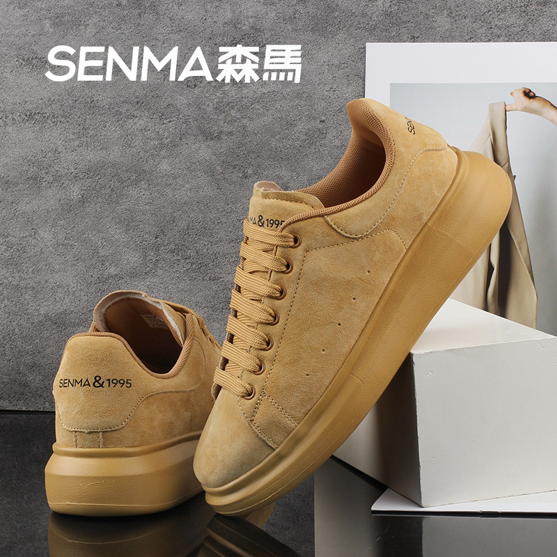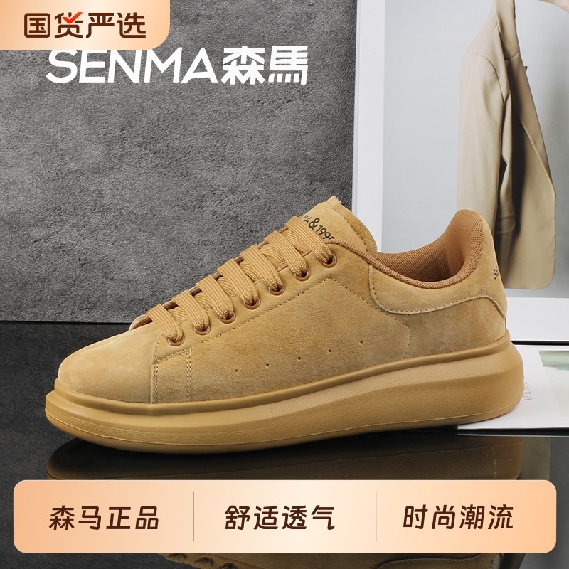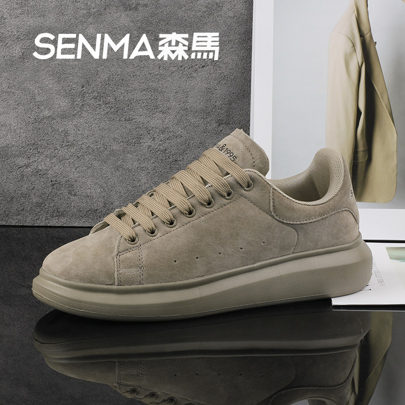 森马港风复古真皮潮鞋男女厚底低帮透气情侣运动鞋反绒皮增高板鞋