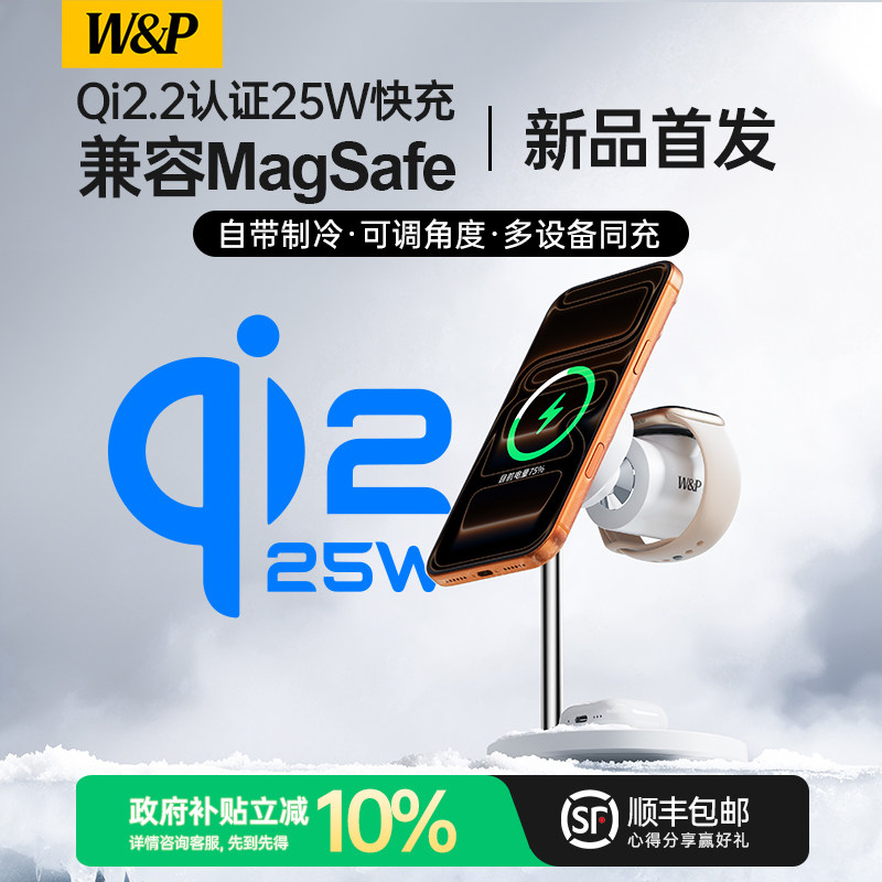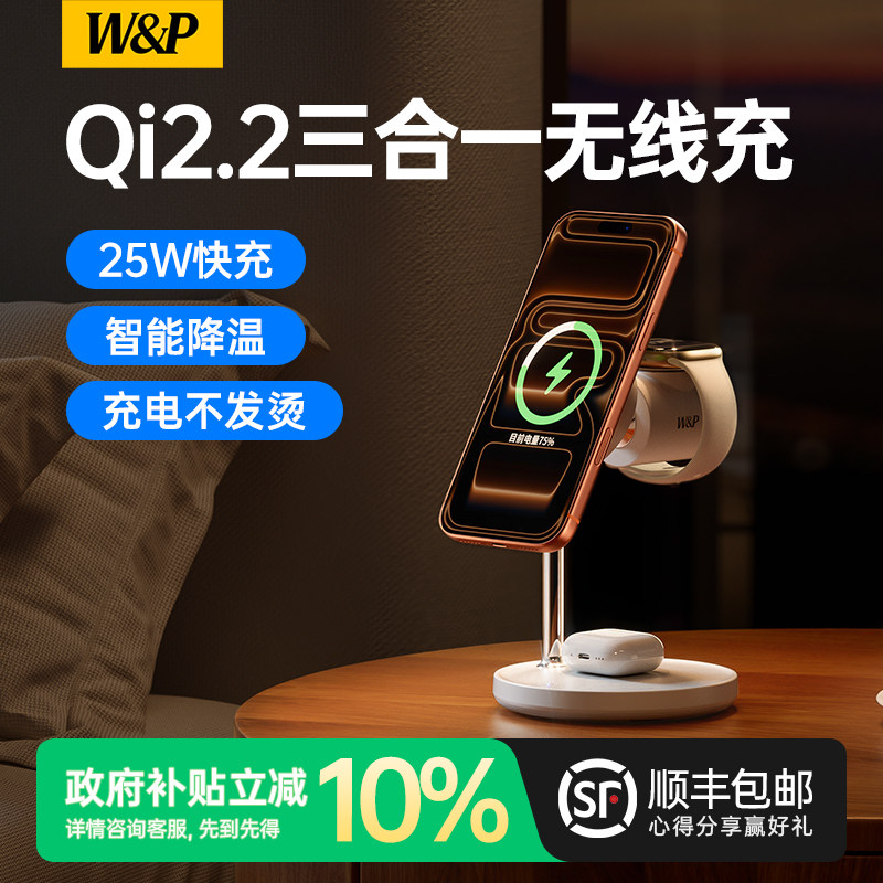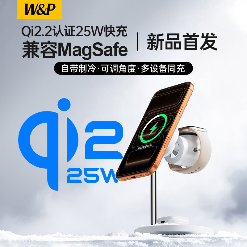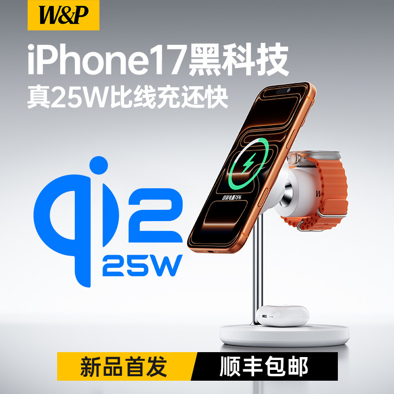 【W&P】Qi2.2三合一无线充电器适用iphone17苹果16手机桌面充电站25W快充散热AppleWatch手表Magsafe磁吸支架