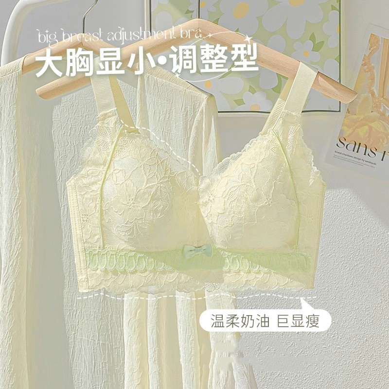 润微茶肌内衣女士大胸显小薄款收副乳聚拢大码上托防下垂蕾丝文胸