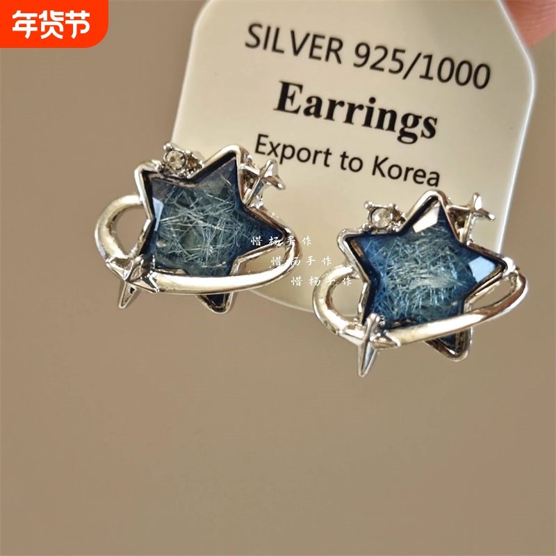 蓝色星空耳钉五角星星四芒星耳环设计感小众925银针耳饰2024新款