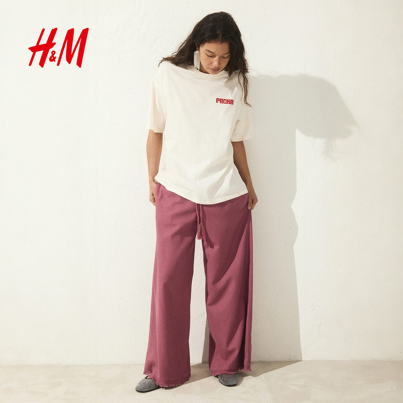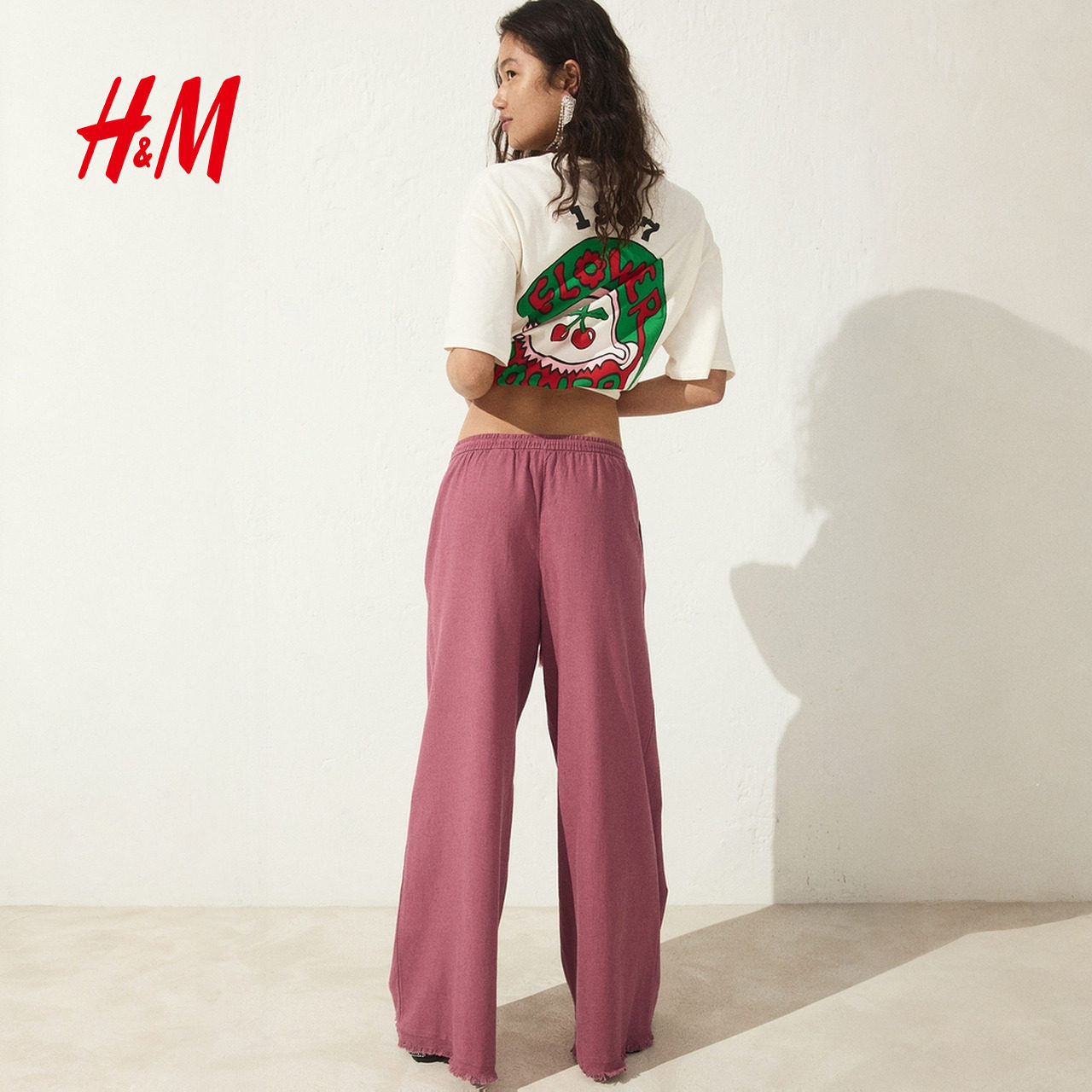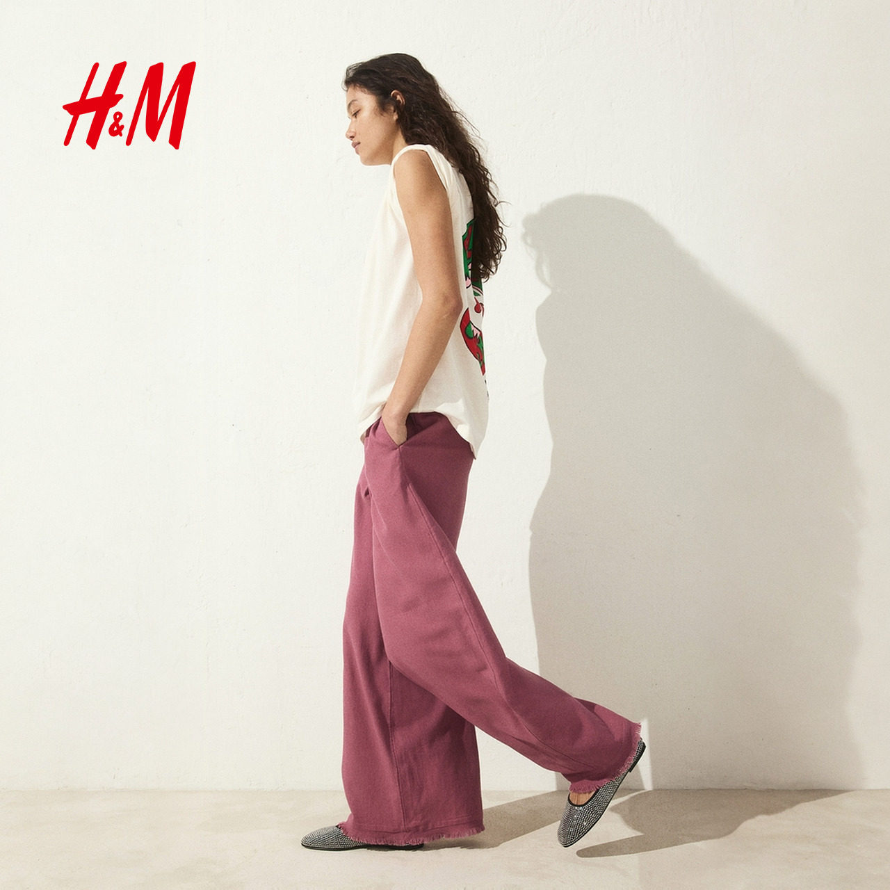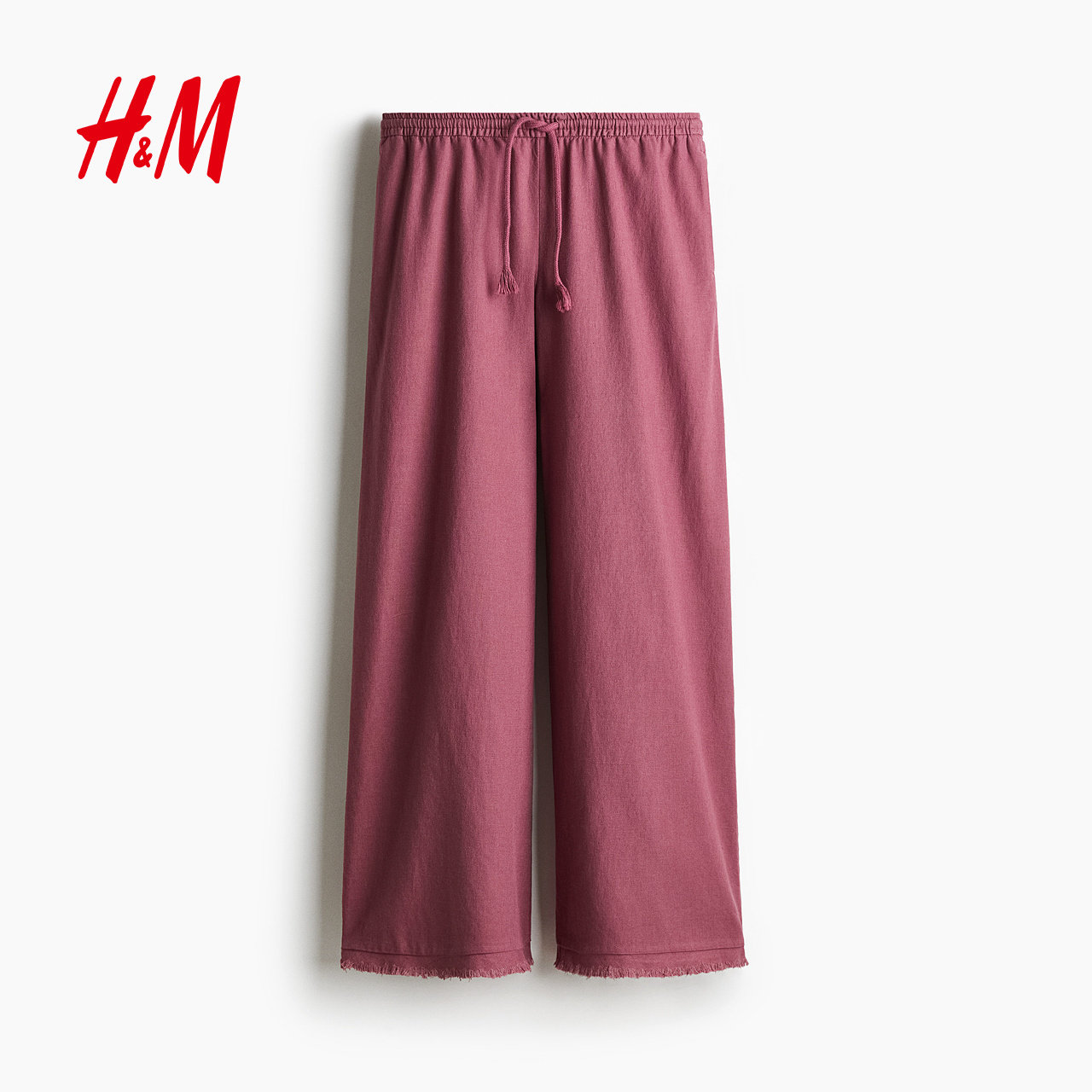 HM女装休闲裤2025冬新款亚麻混纺阔腿波嬉风穿搭抽绳长裤1262025