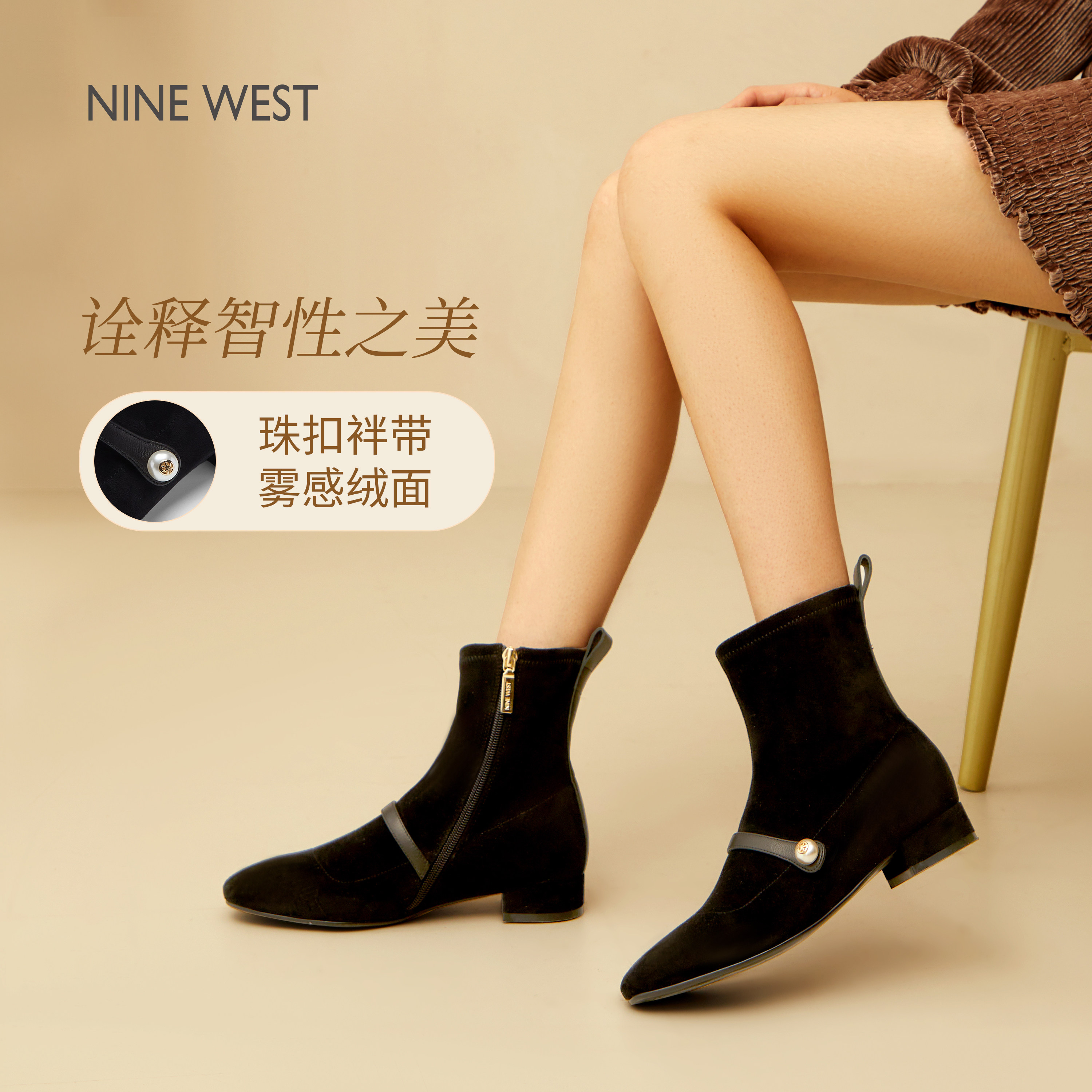 Nine West/玖熙真皮珍珠短靴女秋冬新款粗跟尖头瘦瘦靴弹力靴