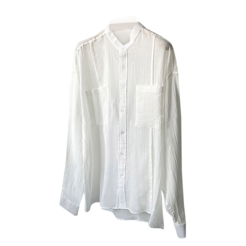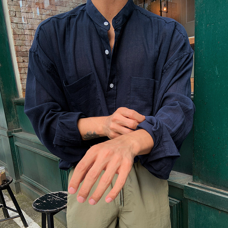 碧舍男装纯色长袖衬衫夏季薄款亚麻宽松高级感衬衣设计感轻薄外套