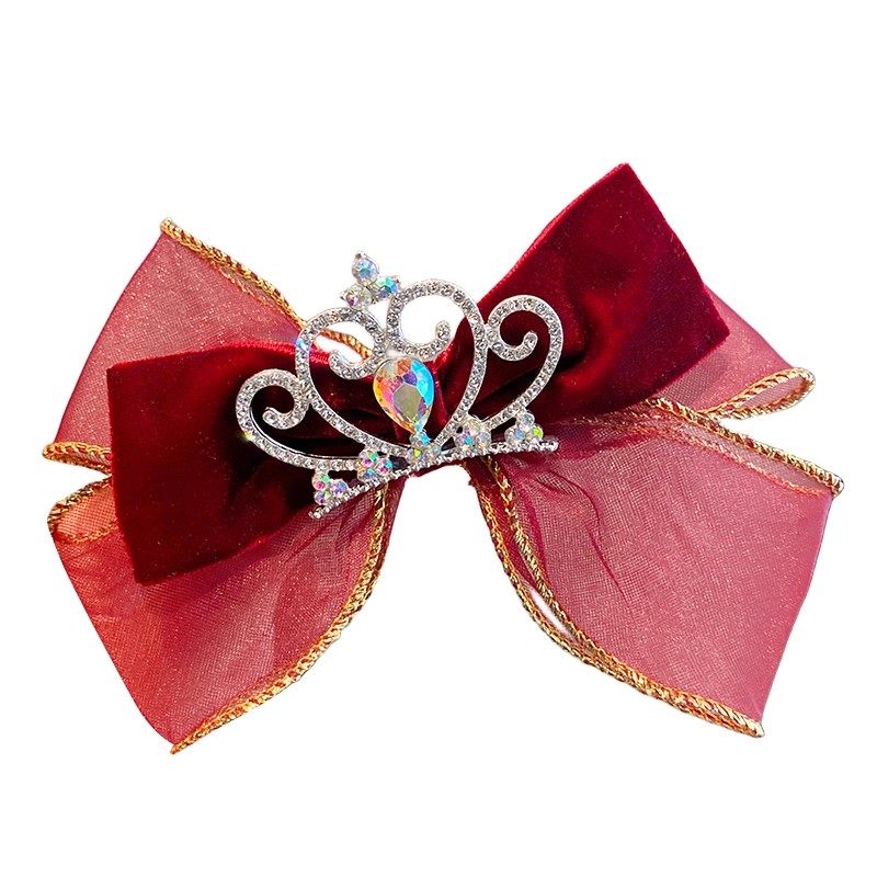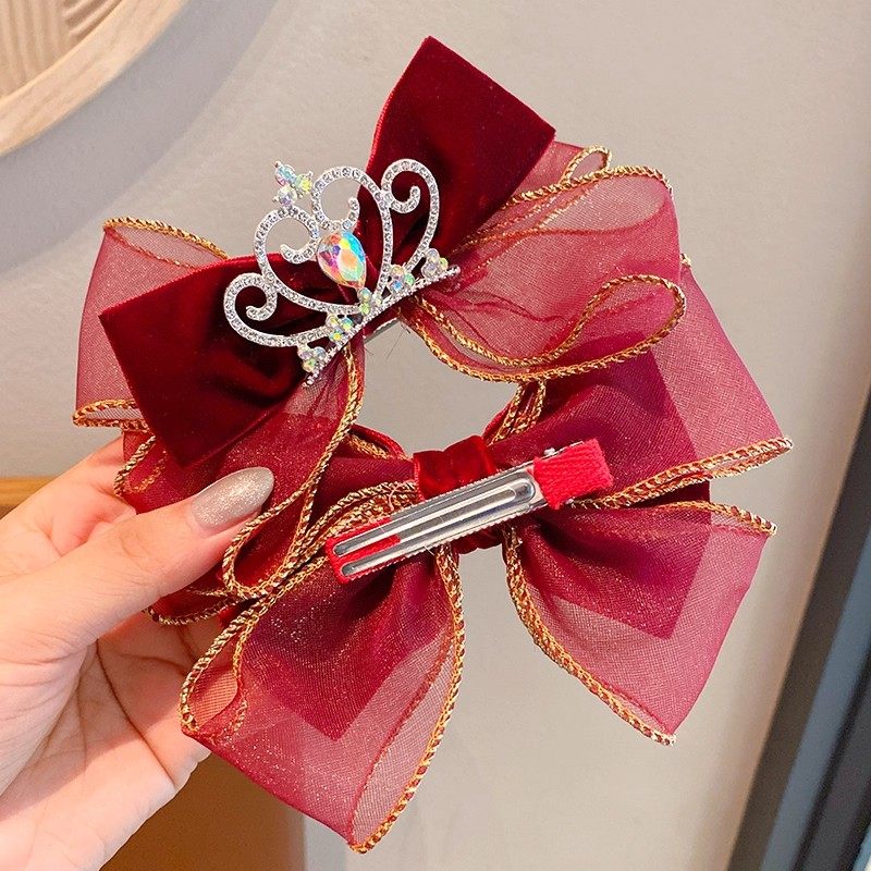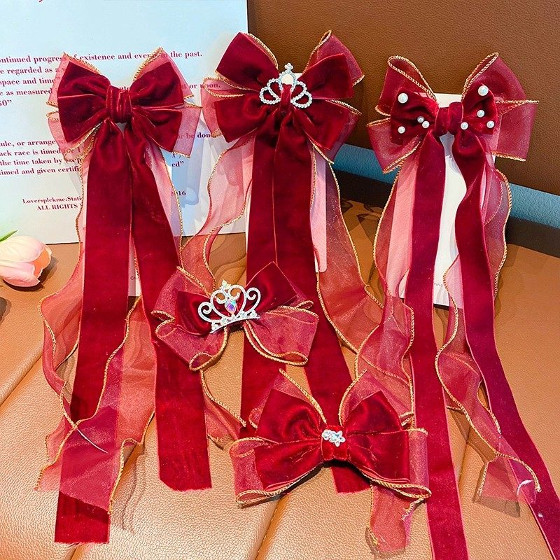 儿童长飘带蝴蝶结皇冠发夹女童宝宝新年发卡公主头饰丝绒红色发饰