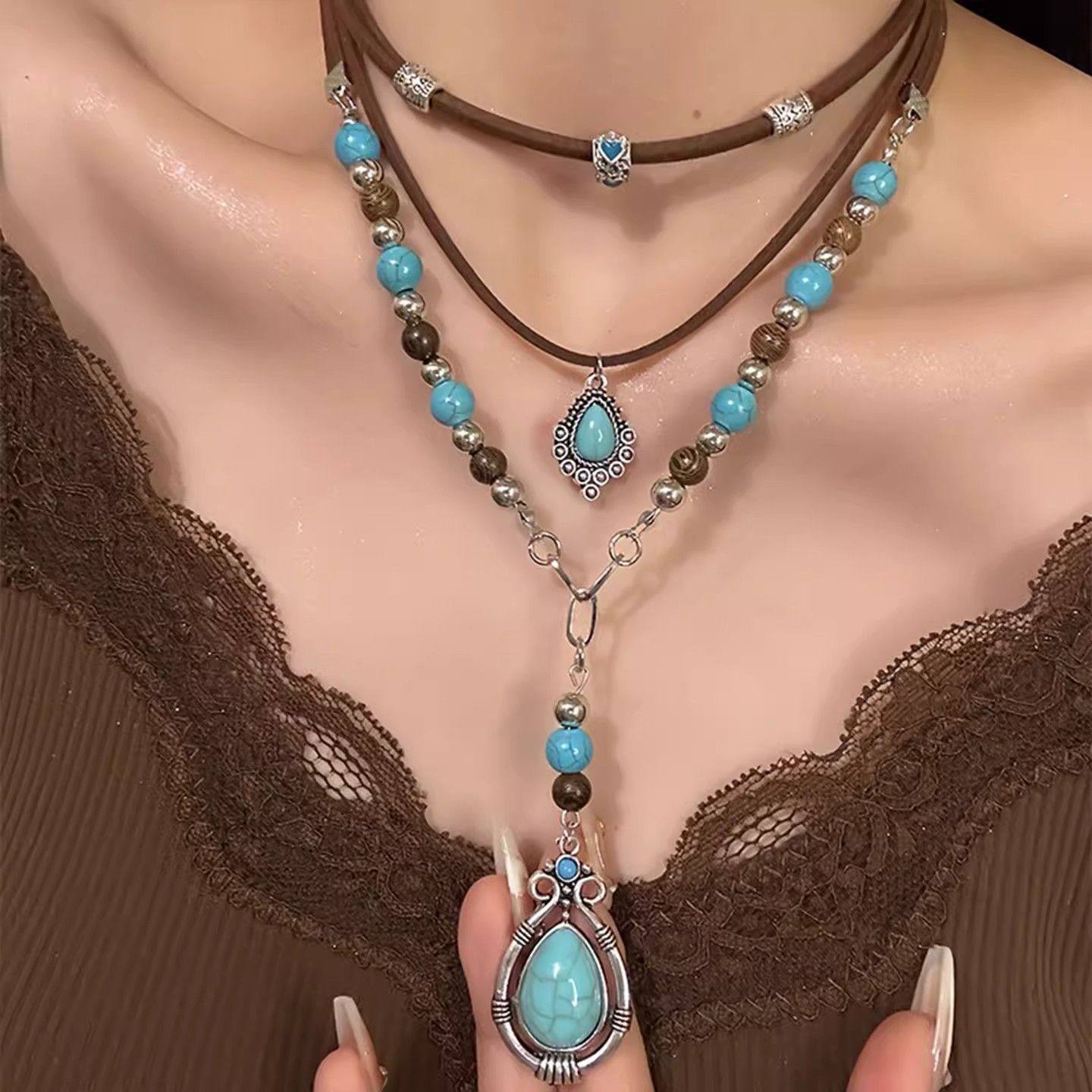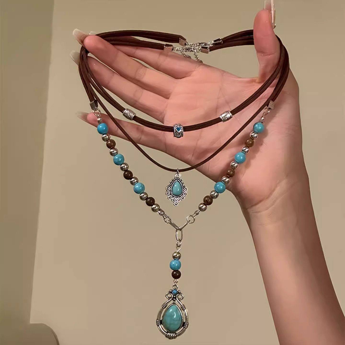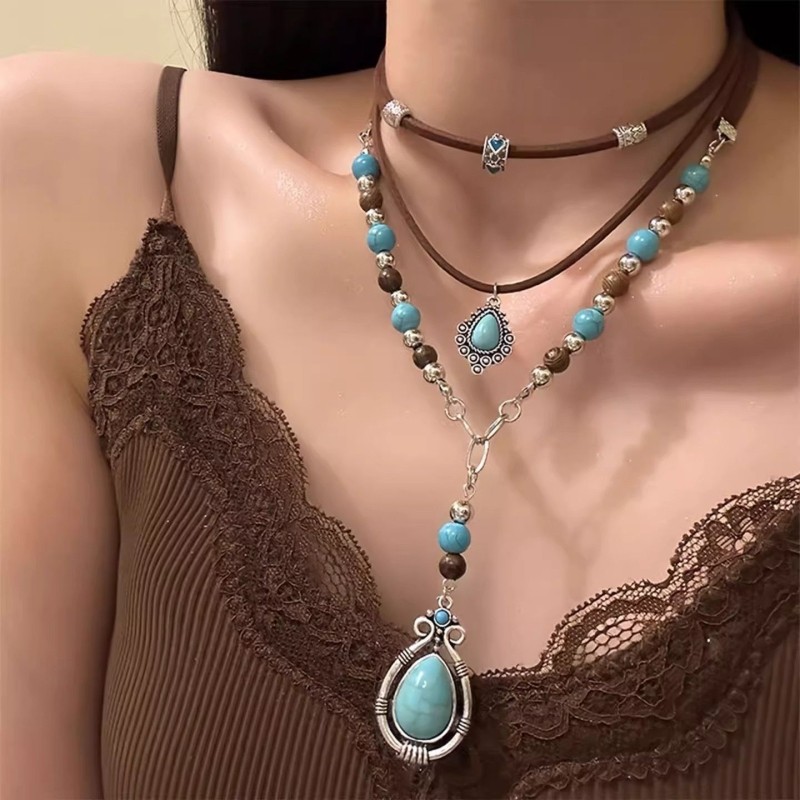 2025新款显眼松石波西米亚复古多层叠戴项链小众设计感锁骨链绿松