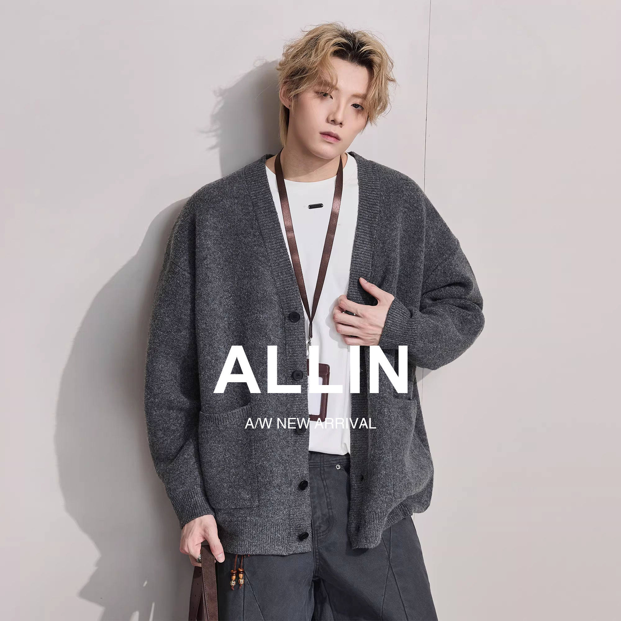 ALLIN 灰色针织开衫毛衣男秋冬潮牌纯色休闲上衣慵懒情侣通勤外套