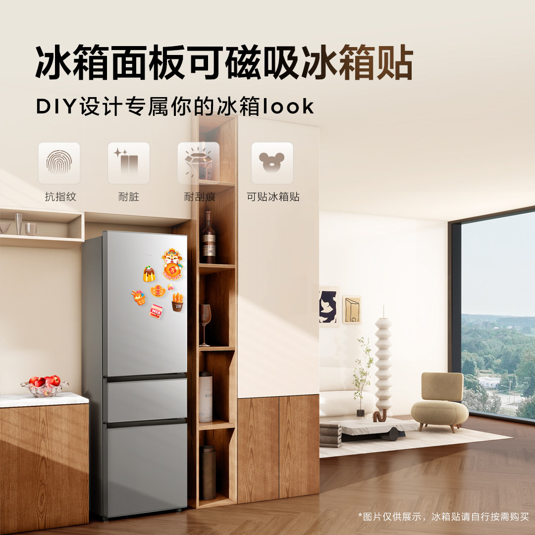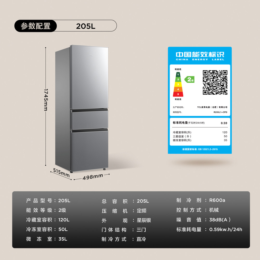 TCL 205升三门三温区小冰箱二级能效小型节能租房宿舍用冷藏冷冻
