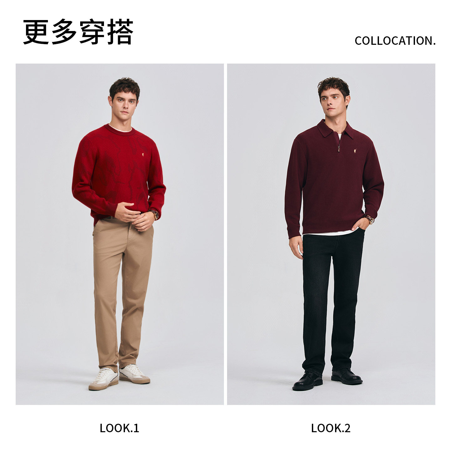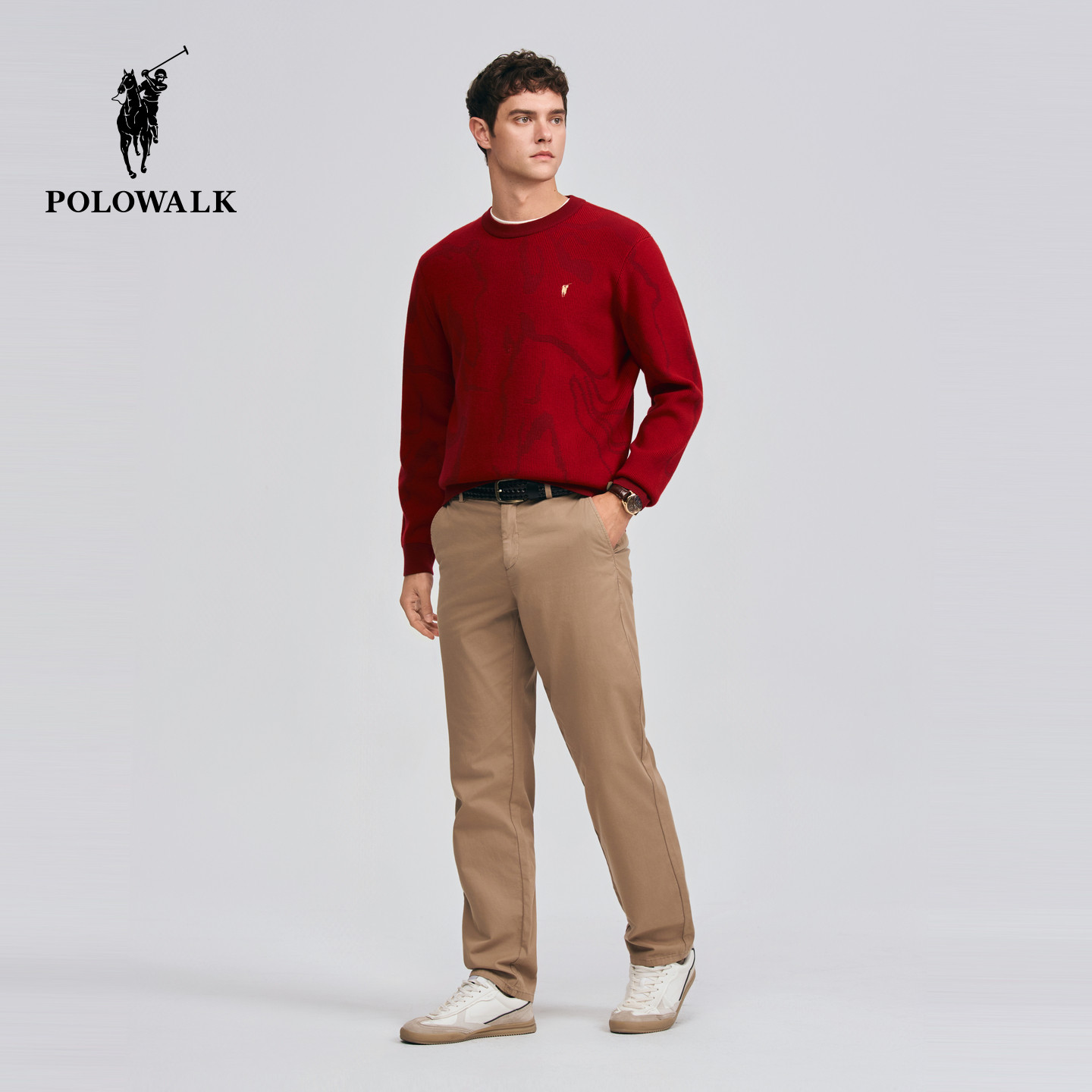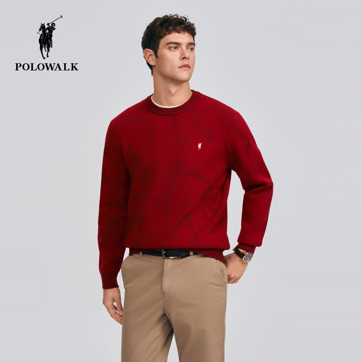 POLOWALK男式针织衫2026春季新品新年红圆领红色套头衫本命年毛衣