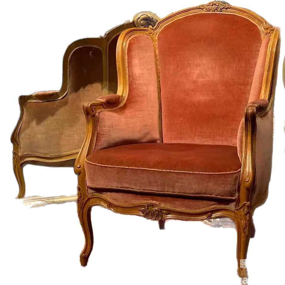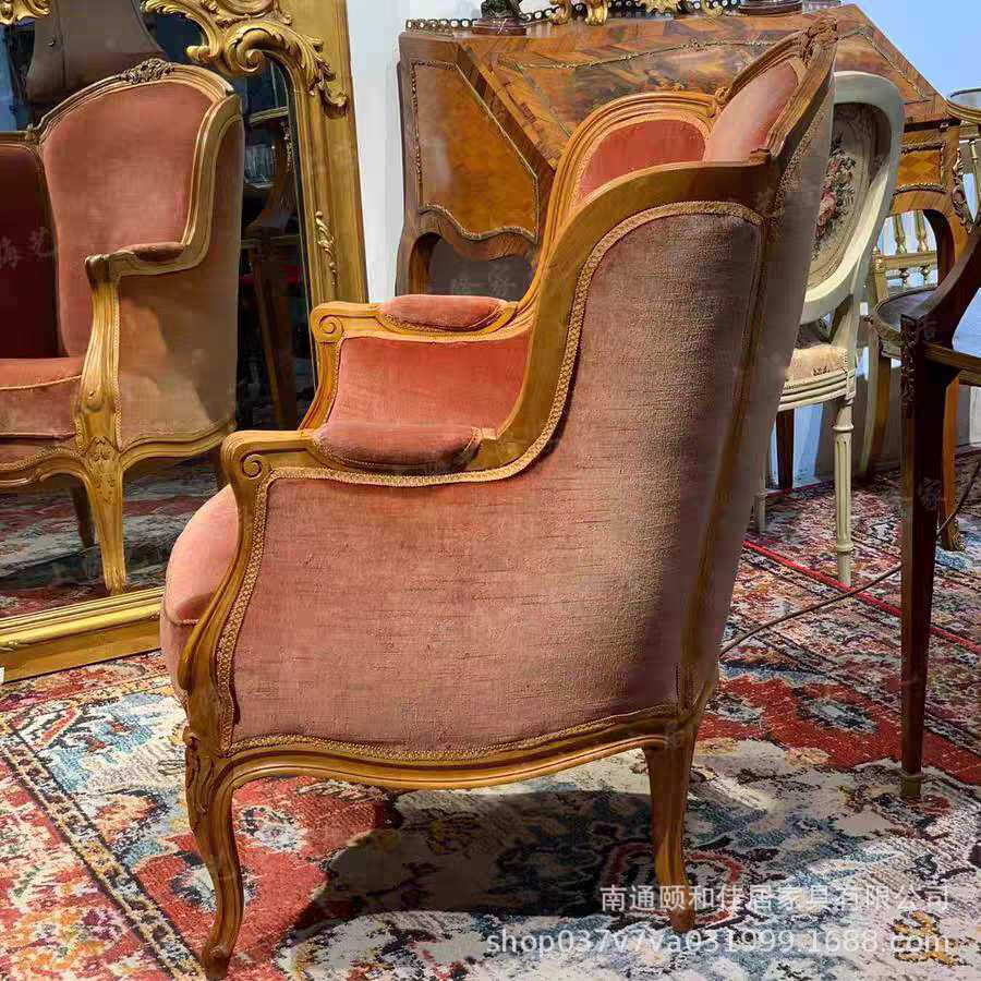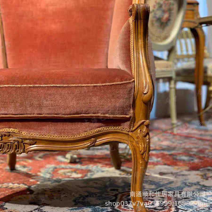 美式实木雕花单人沙发客厅复古布艺休闲沙发椅别墅影楼接待沙发椅