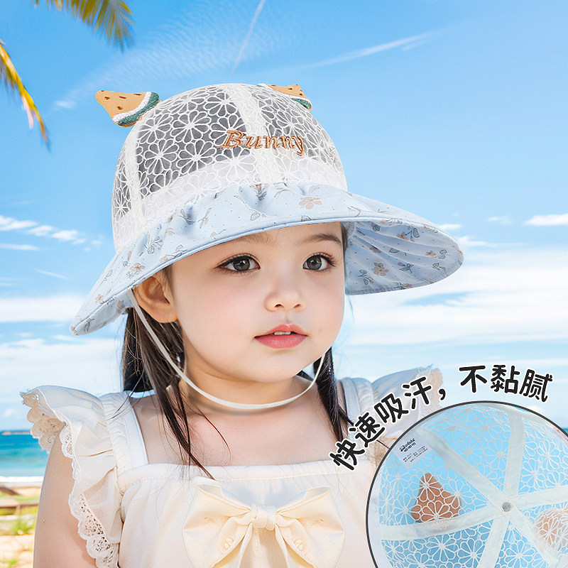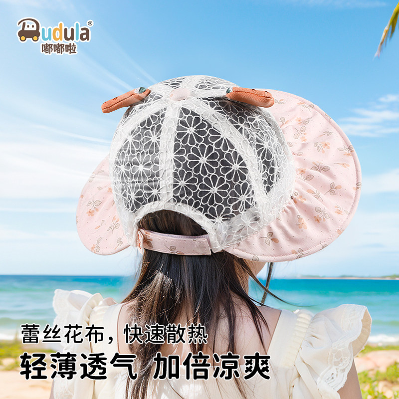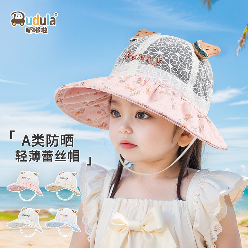 嘟嘟啦夏季女孩大檐遮阳帽蕾丝薄纱公主帽女童出游防晒凉帽渔夫帽