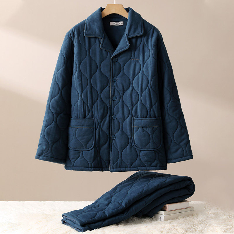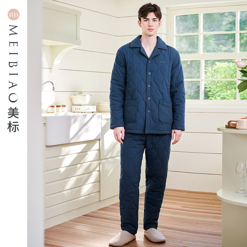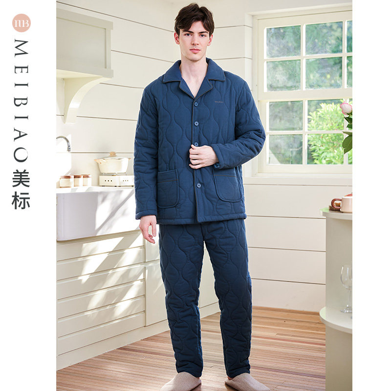 美标秋冬男士三层加厚夹棉纯棉睡衣套装保暖全棉休闲可外穿家居服