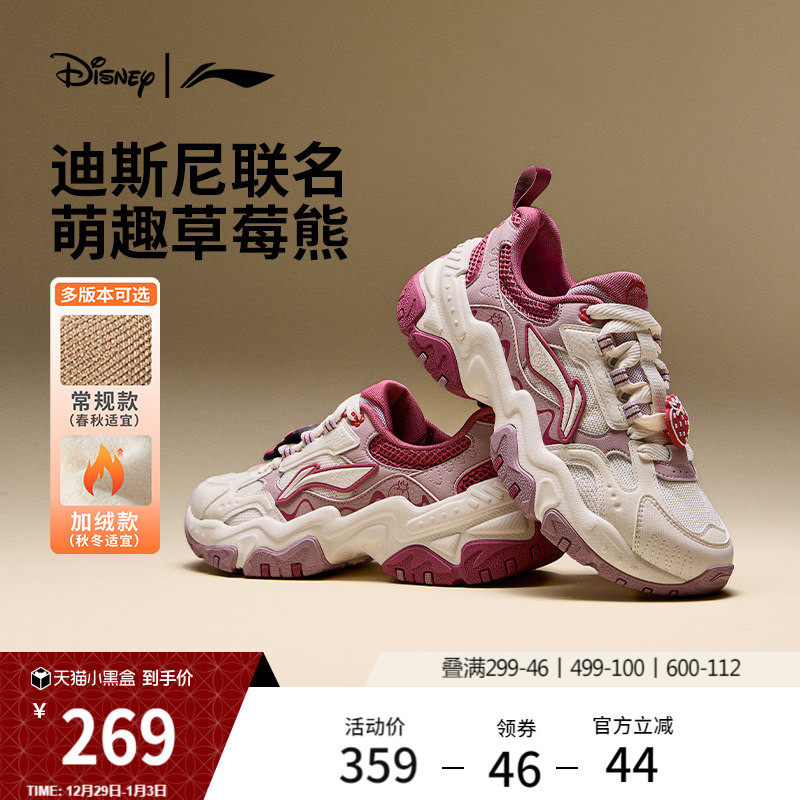 李宁红糖迪士尼草莓熊联名丨休闲鞋女25冬季新款加绒老爹鞋运动鞋