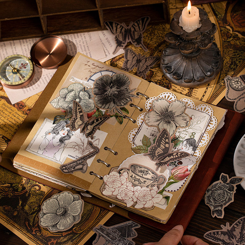 M|古籍追忆贴纸包 英式复古蝴蝶乐器钥匙怀表可书写简约手账拼贴
