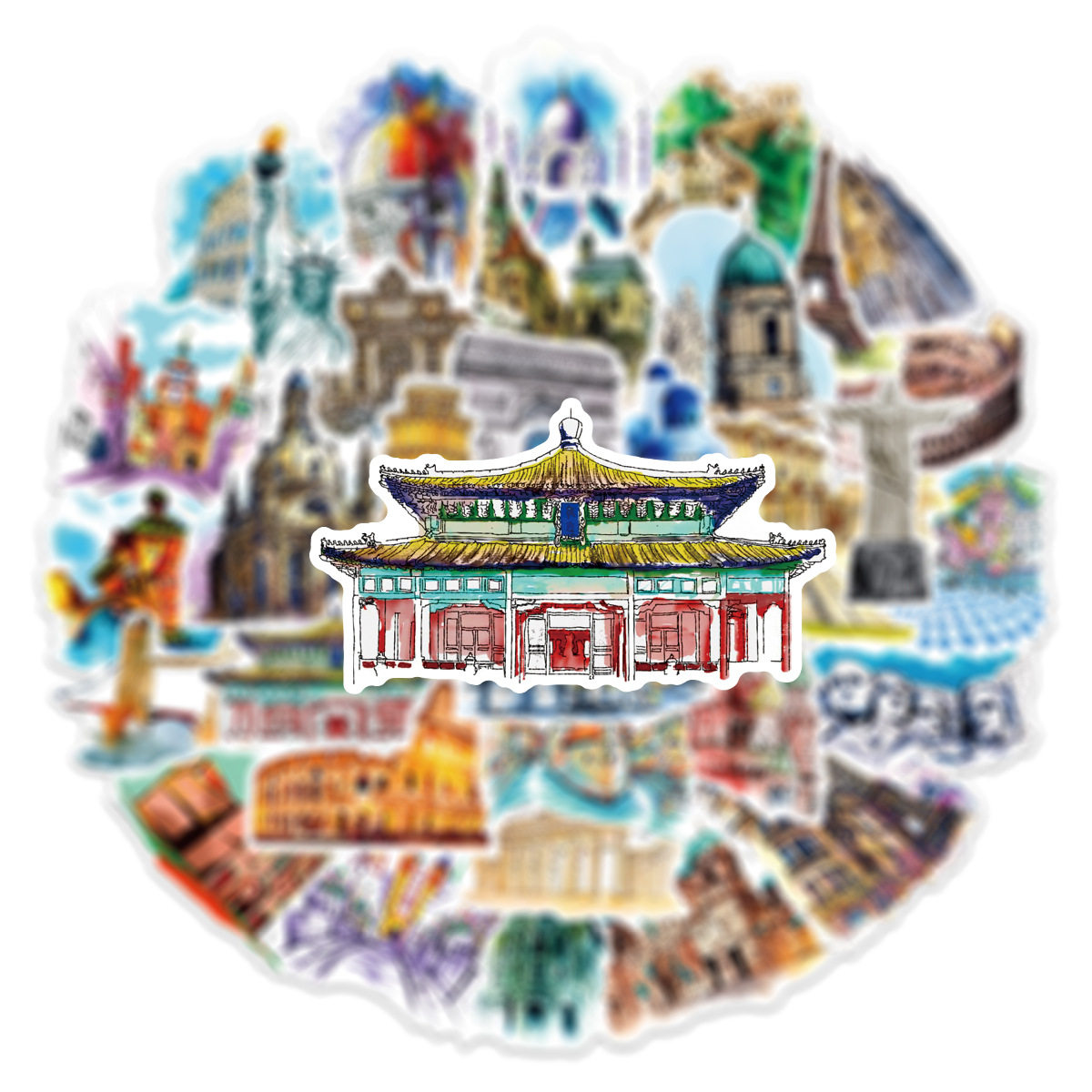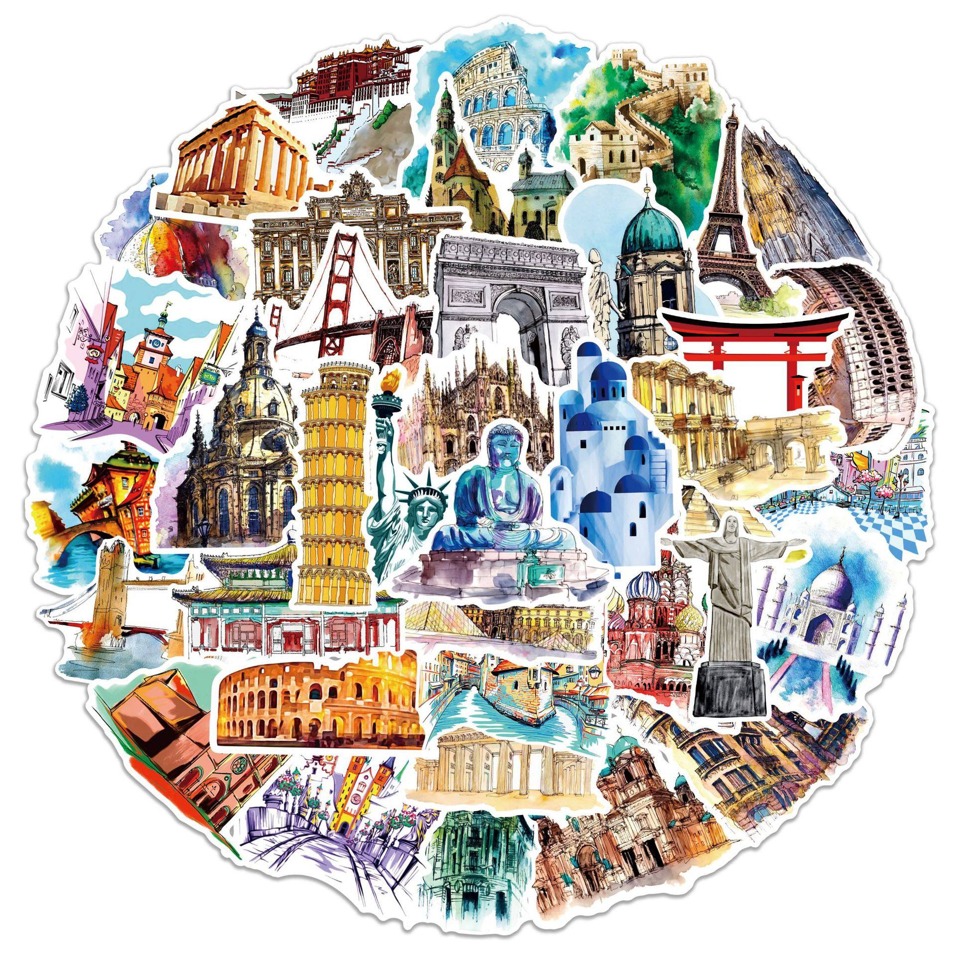 50张旅行世界地标建筑贴纸手账行李箱手机壳日记吉他防水贴纸