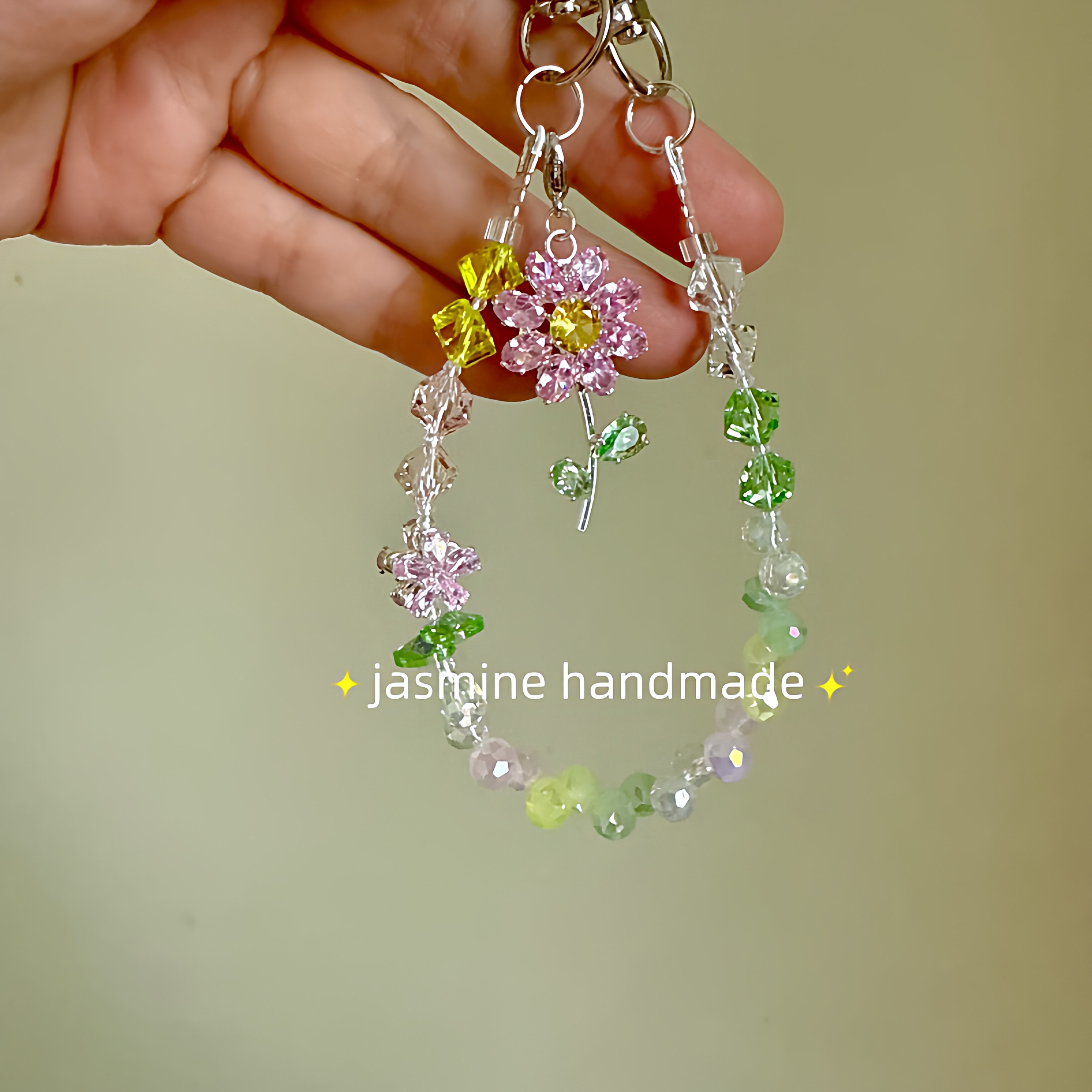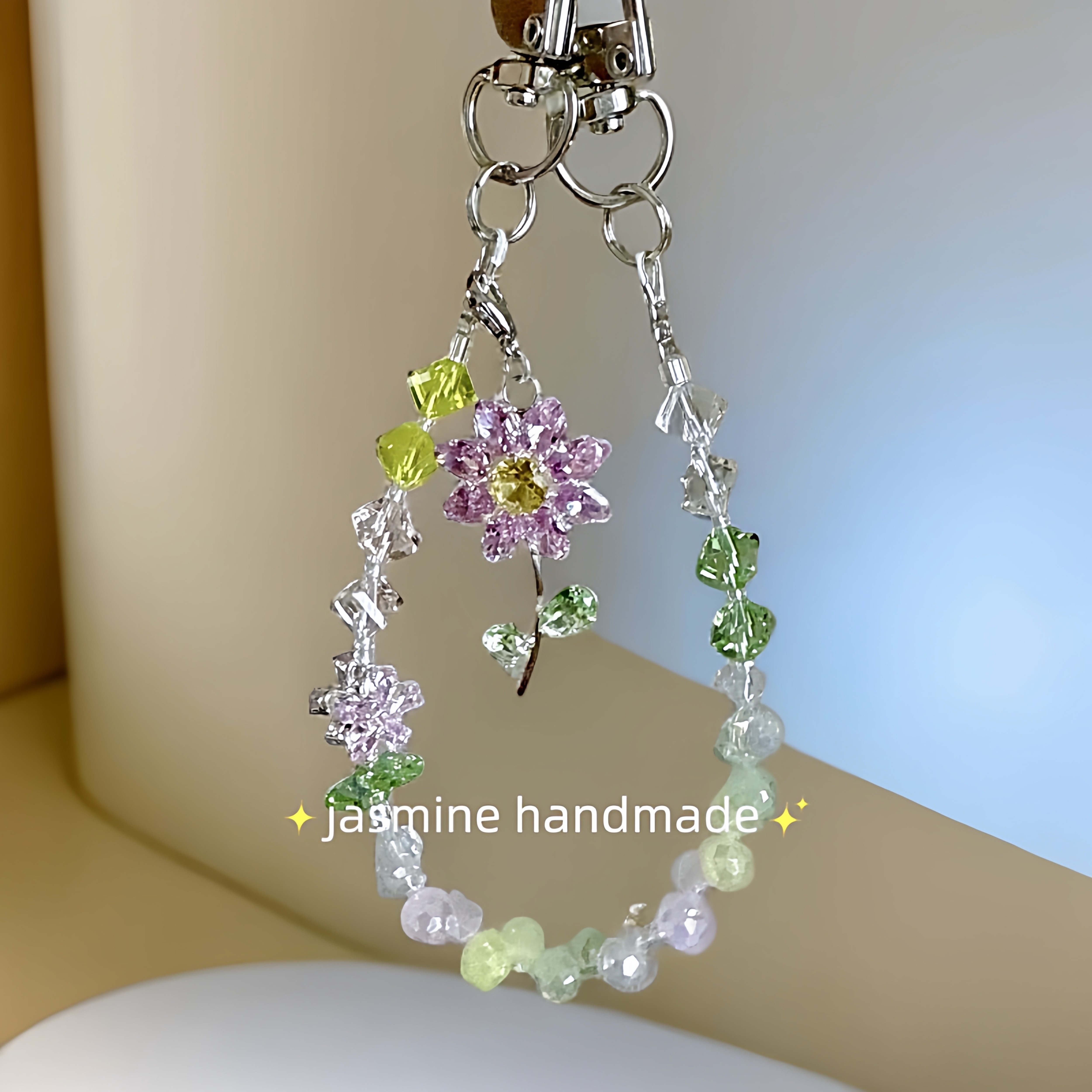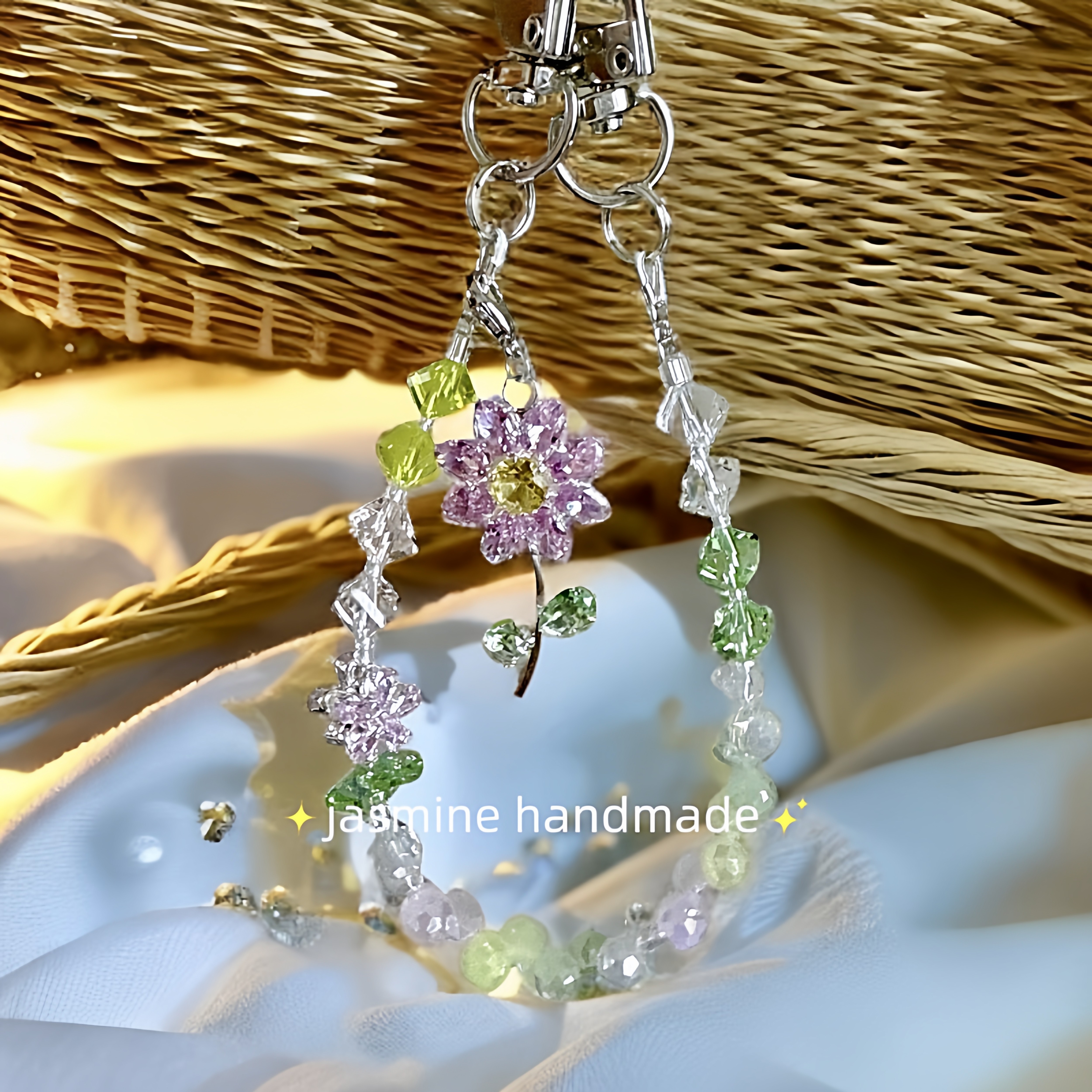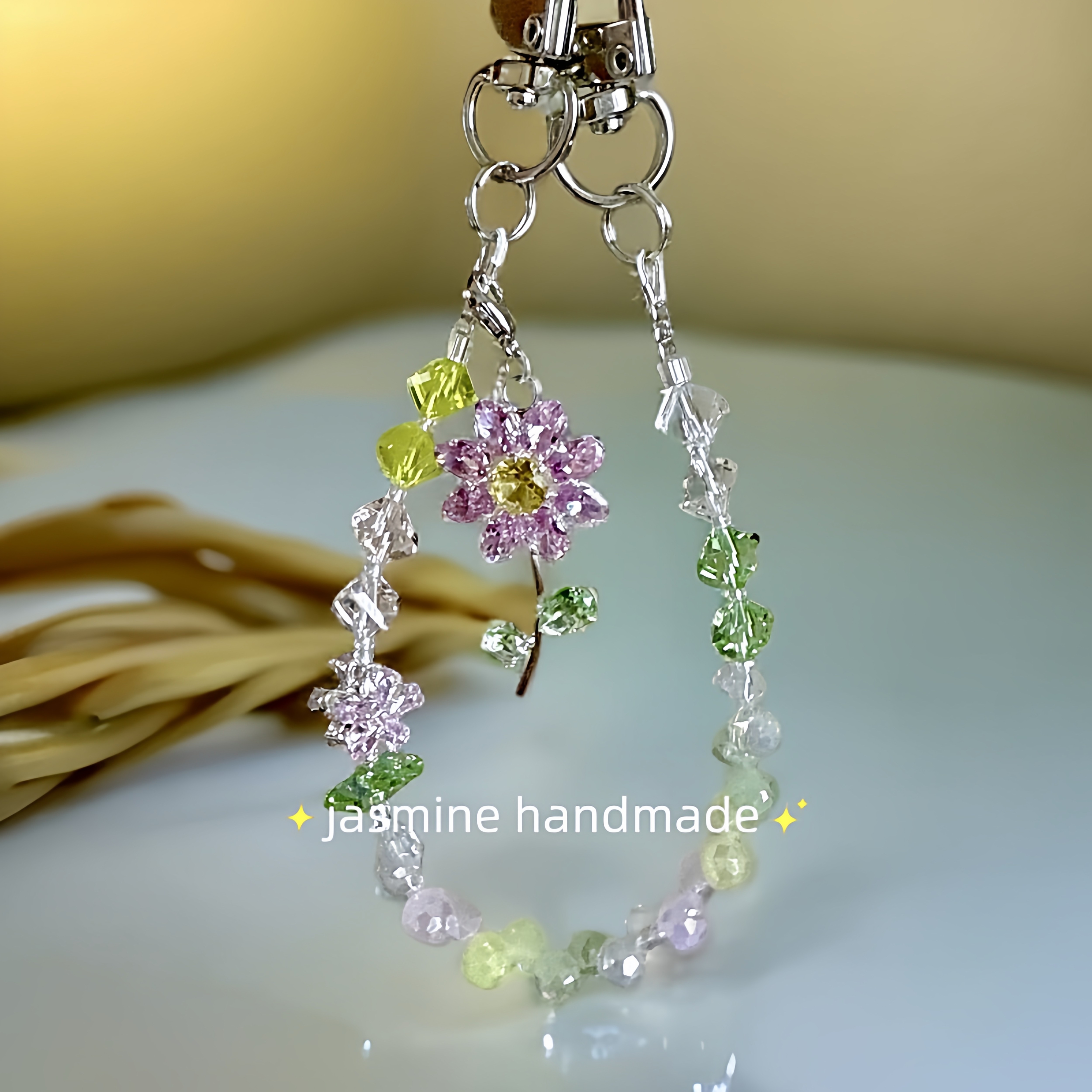 夏日小清新双耳手机链挂件包挂粉色水晶锆石花朵手机挂绳ccd相机