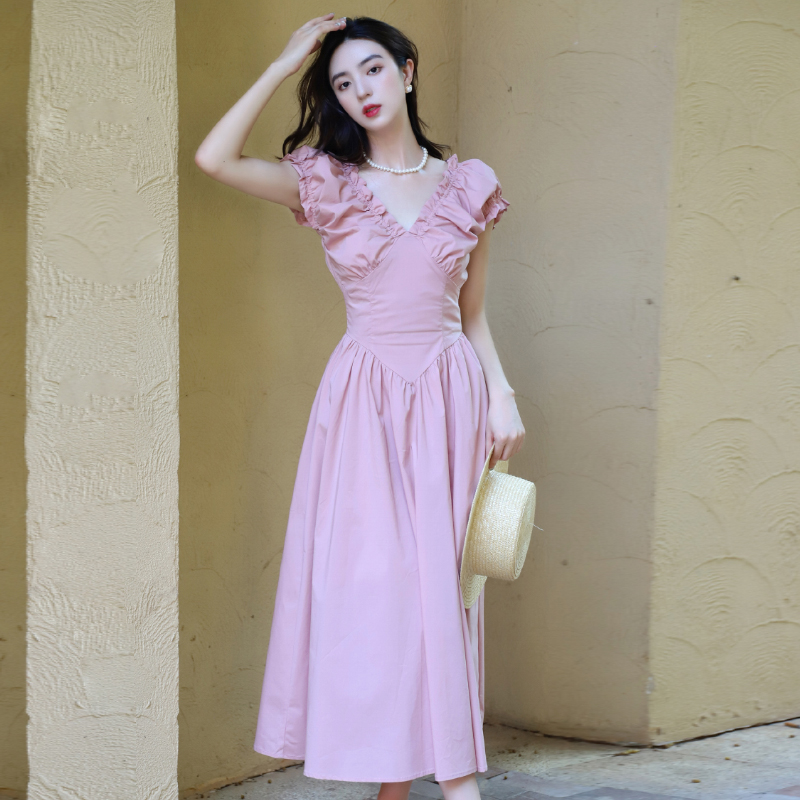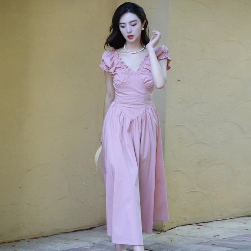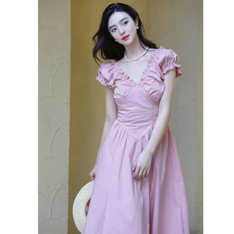 法式复古裙子粉色连衣裙收腰显瘦V领泡泡袖过膝中长裙小粉裙女夏