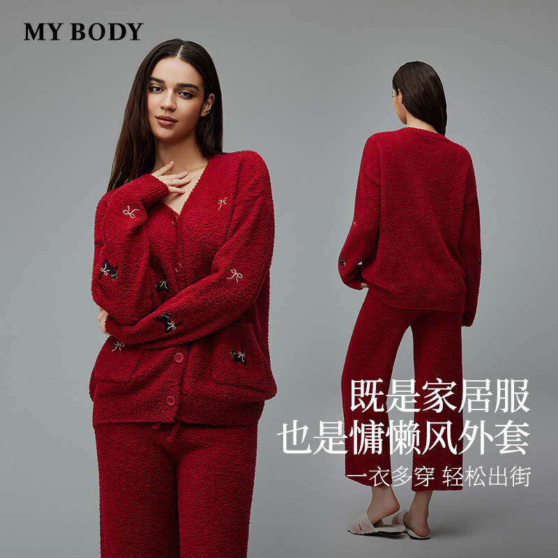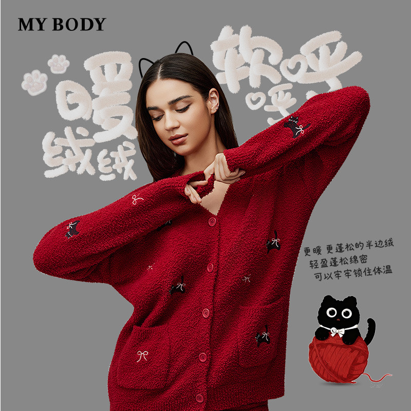 MYBODY商场同款冬季新款本命年红色睡衣女猫咪可外穿半边绒家居服