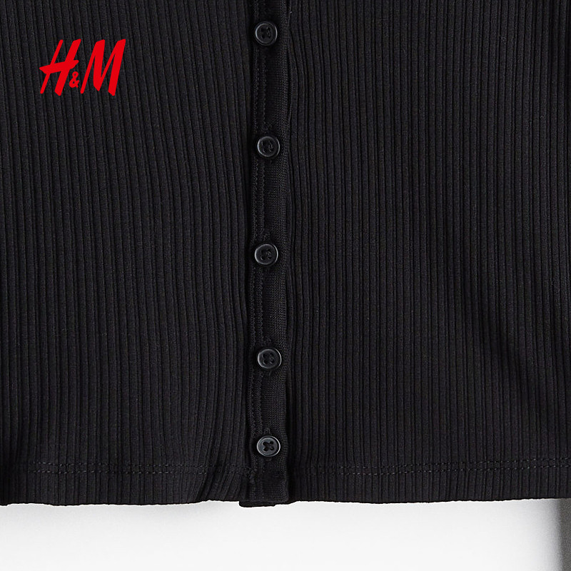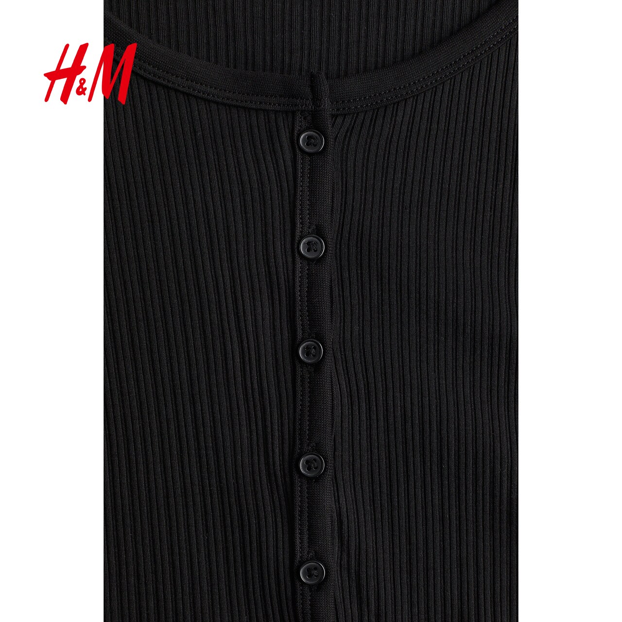 HM女装T恤冬季休闲圆领时尚纽扣前襟罗纹短款上衣打底衫1234738