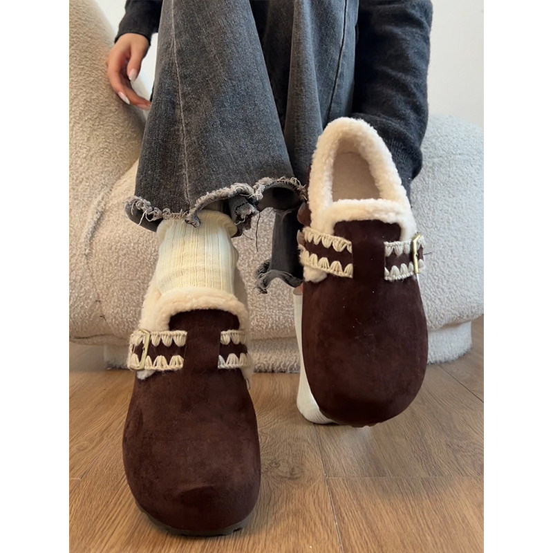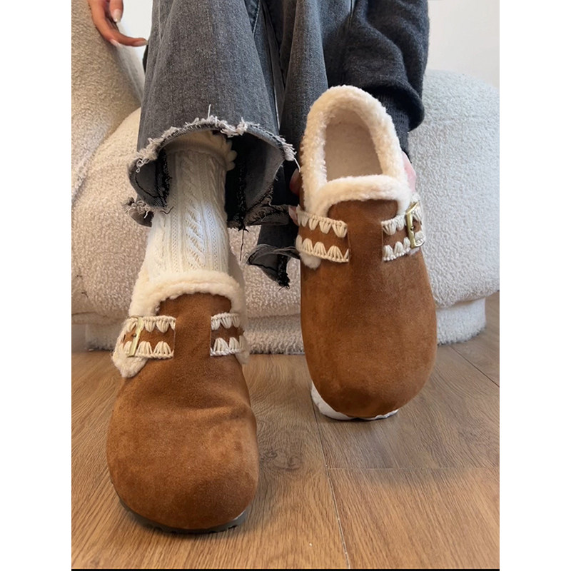 2025新款冬季加棉加绒保暖平底棉鞋女款一脚蹬勃肯鞋雪地靴内增高