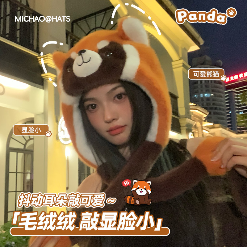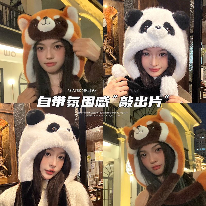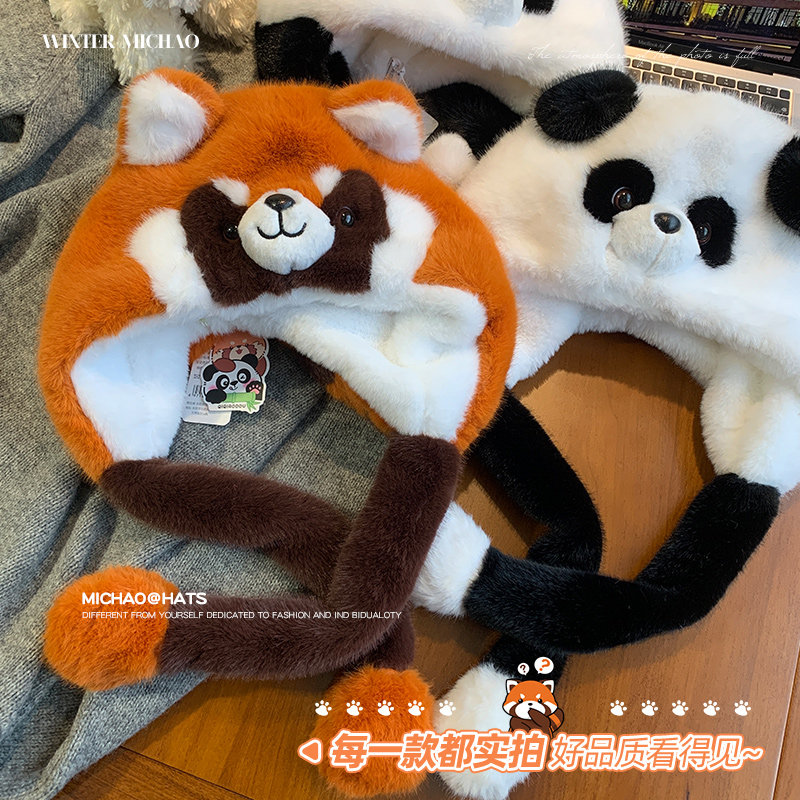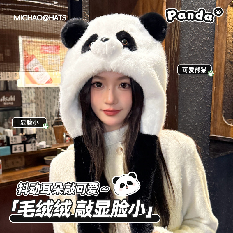 可爱熊猫毛绒帽子女秋冬季新款红山动物园防风护耳雷锋帽耳朵会动