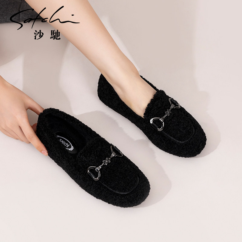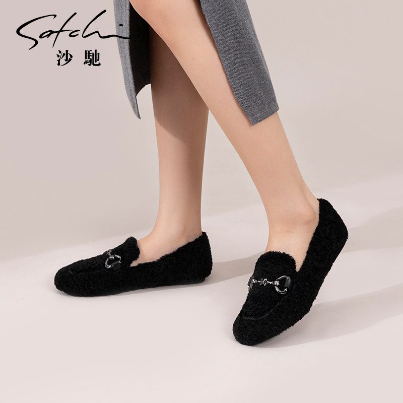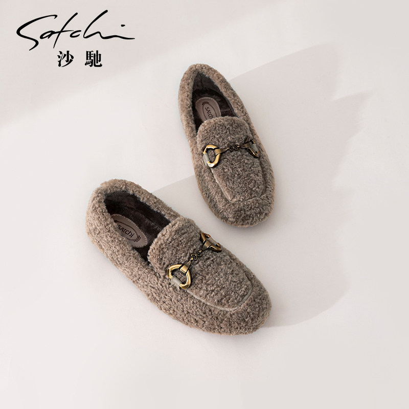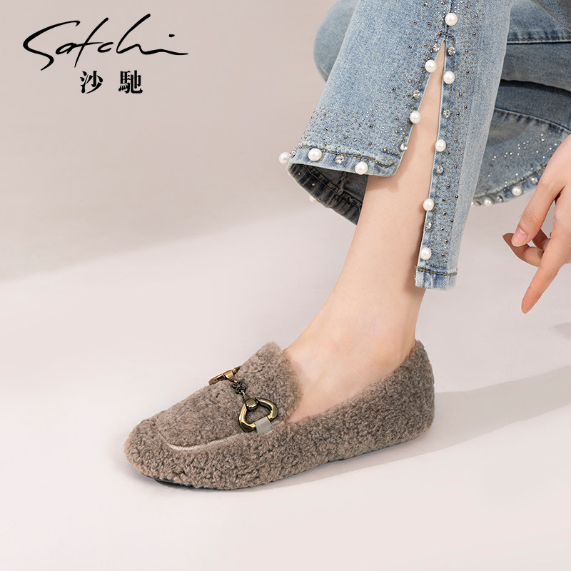 沙驰女鞋加绒保暖一脚蹬豆豆鞋秋冬新款乐福复古单鞋软底休闲棉鞋