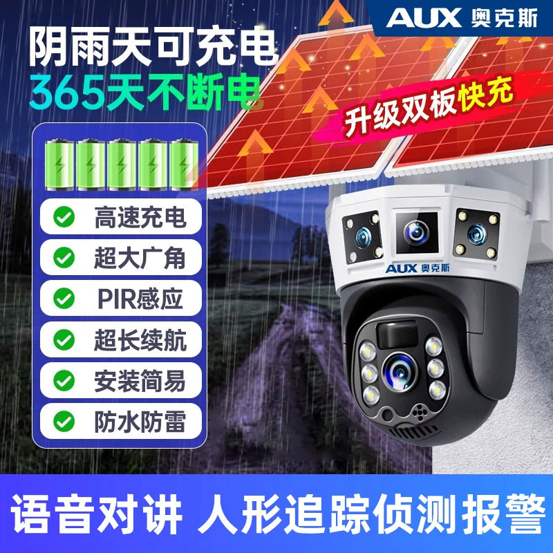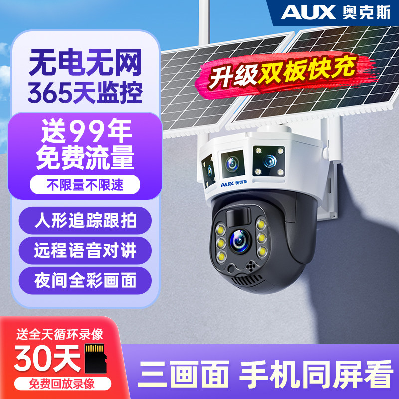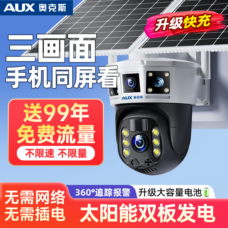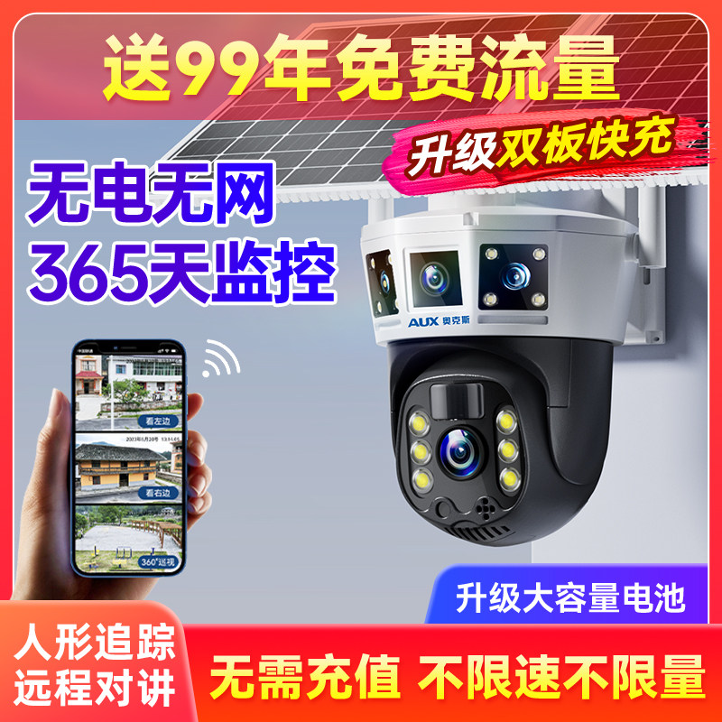 奥克斯太阳能监控摄像头无电无网室外360度无死角手机远程免插电