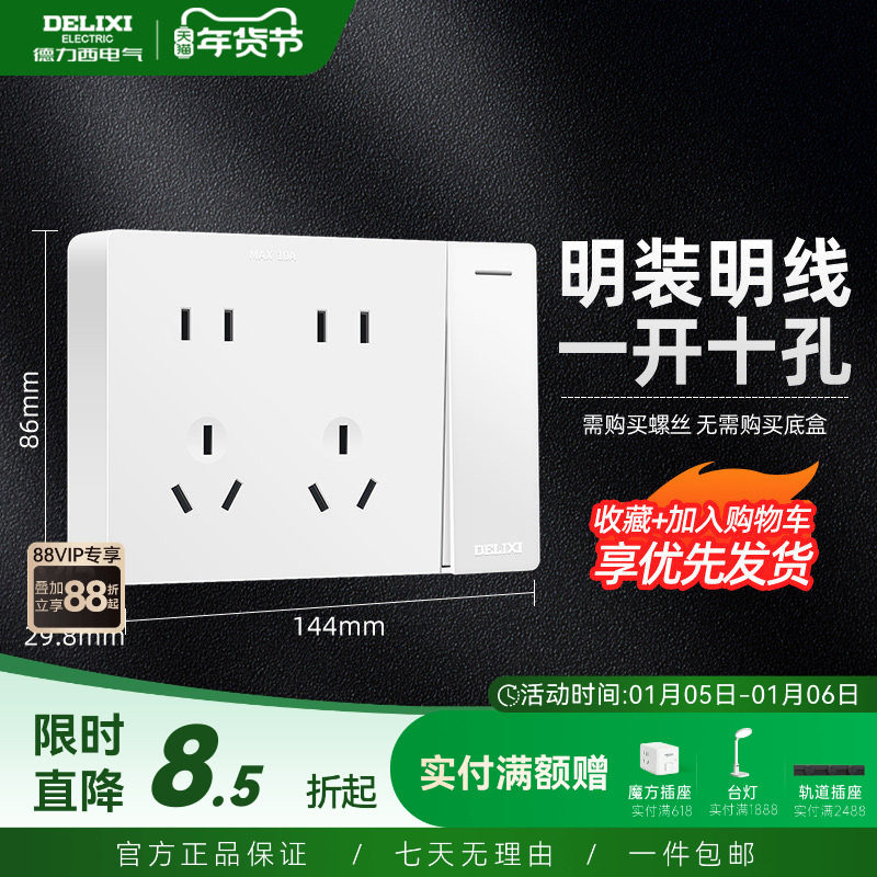 德力西开关插座明装一位一开10十孔插座明线插座面板多孔墙壁插座