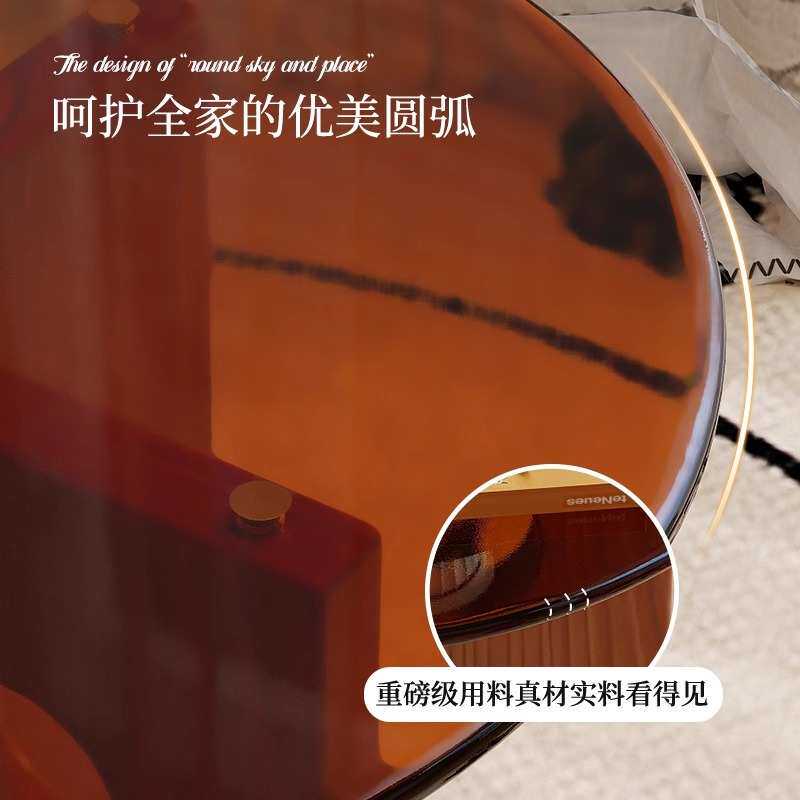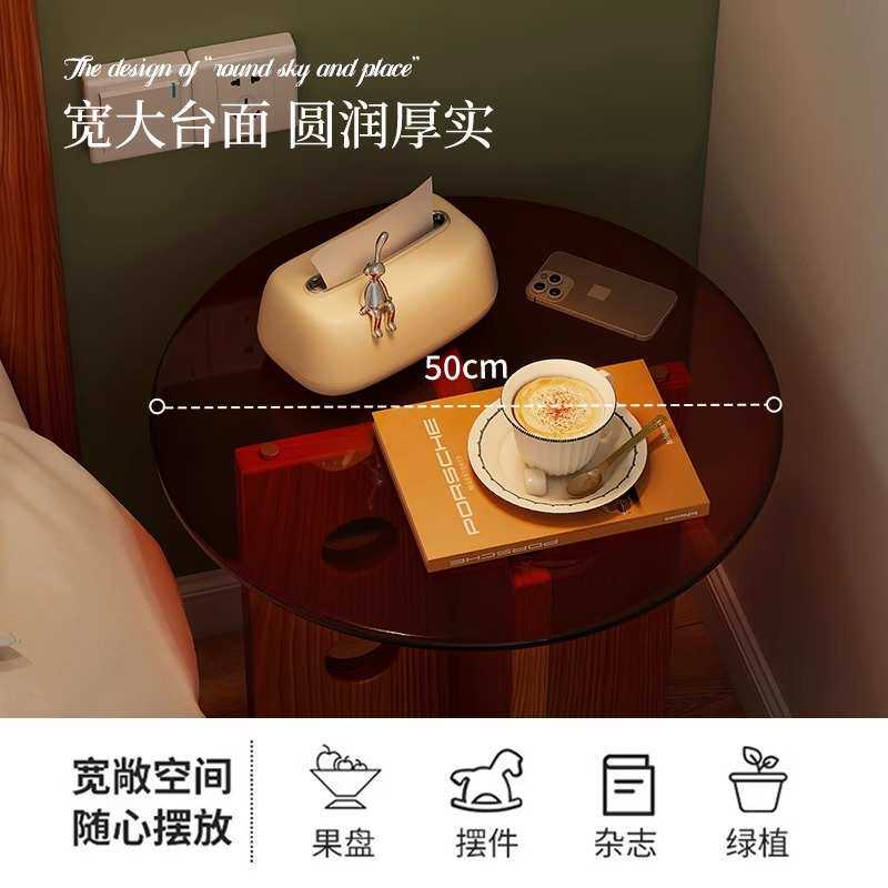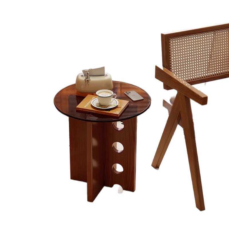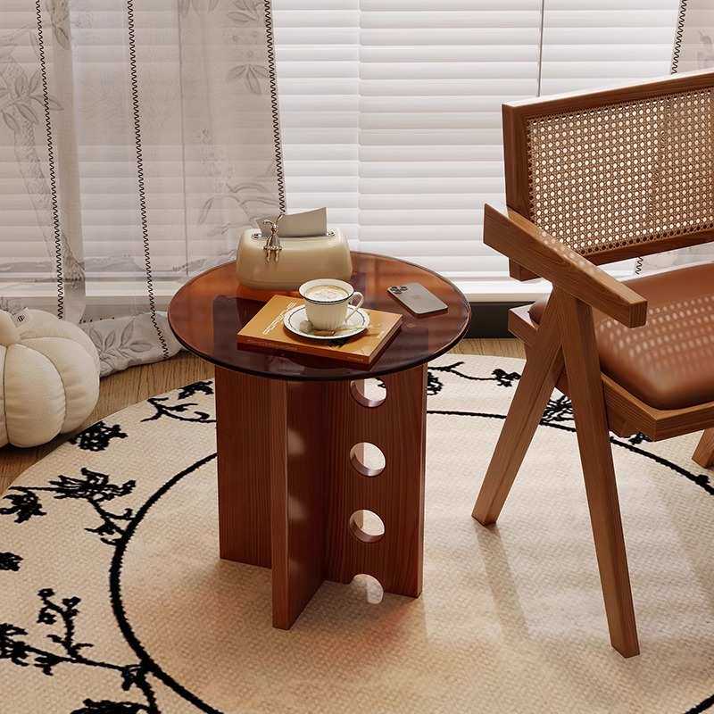 实木小圆桌阳台轻奢玻璃茶几沙发洞洞边几法式中古茶几床头圆桌子