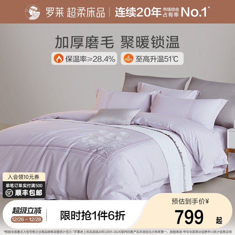 罗莱家纺秋冬全棉加厚磨毛简约床单被套田园风1.8米双人床四件套