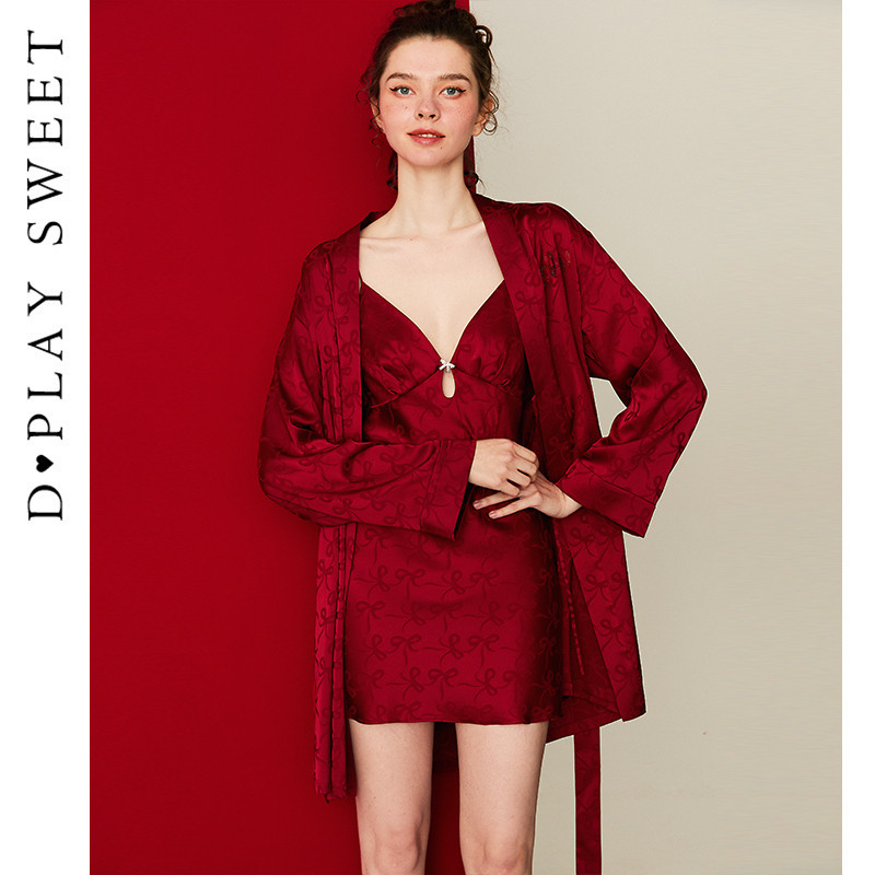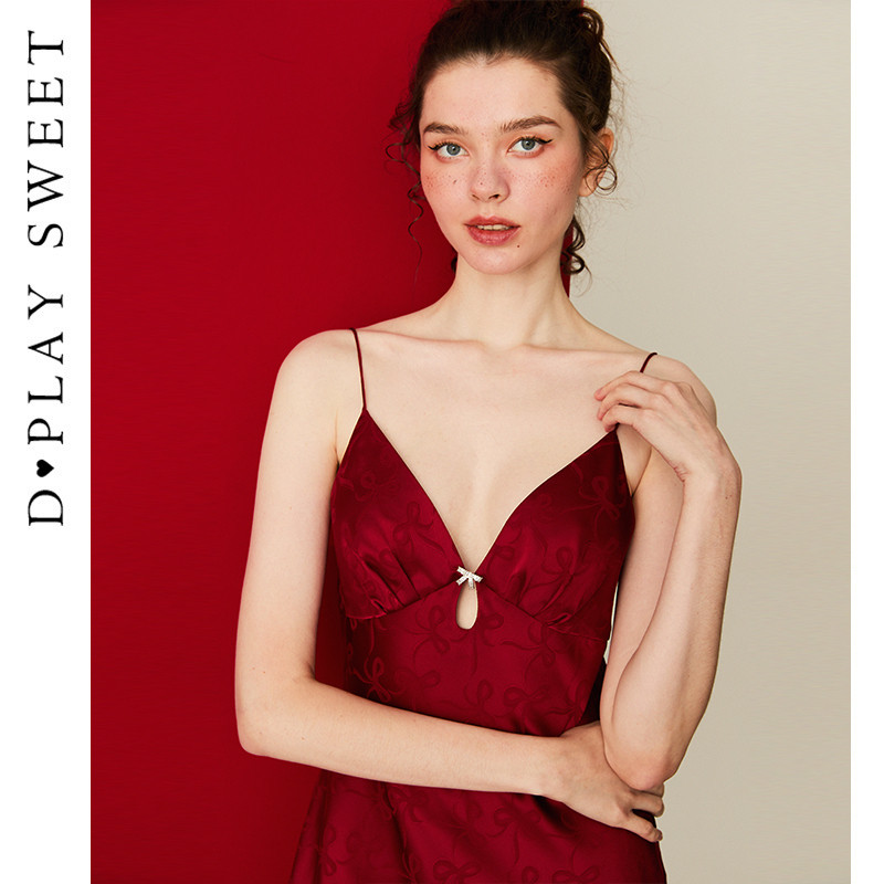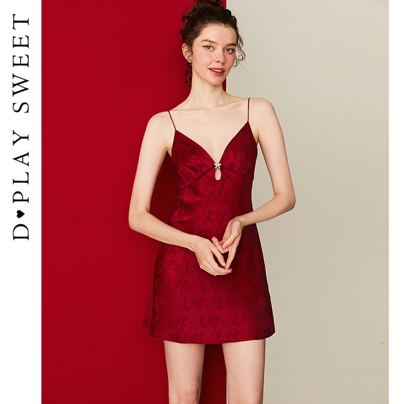 DPLAYSWEET红色蝴蝶结提花镂空吊带睡裙短款轻奢缎面睡衣2025冬季