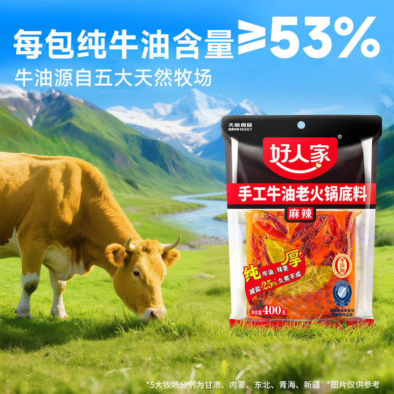 好人家火锅底料手工牛油400g四川麻辣烫火锅料老火锅微辣小块调料