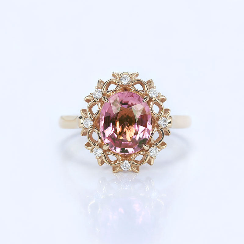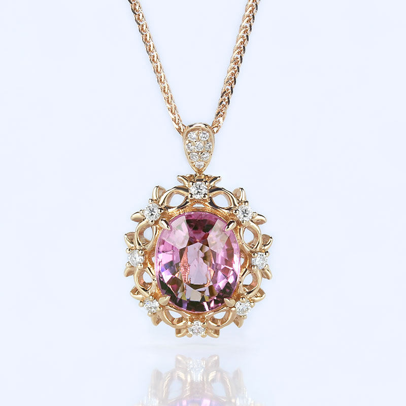 18K玫瑰金天然粉红色碧玺戒指吊坠两用款 镶钻石宝石项链女款正品